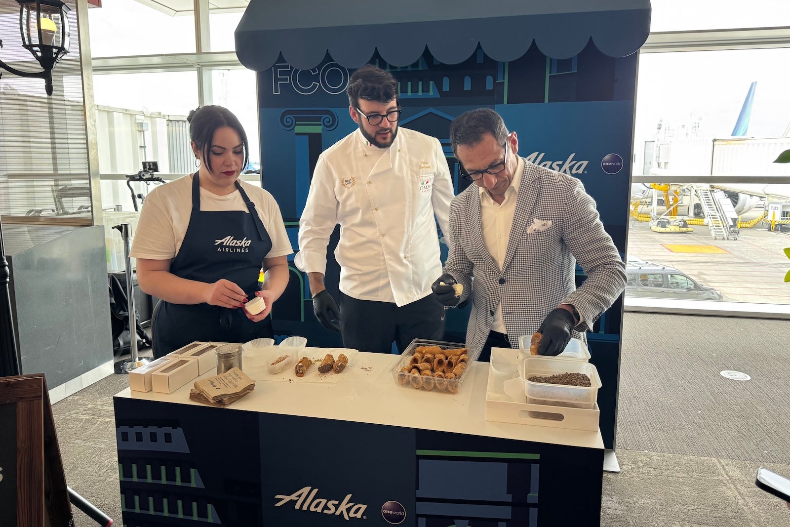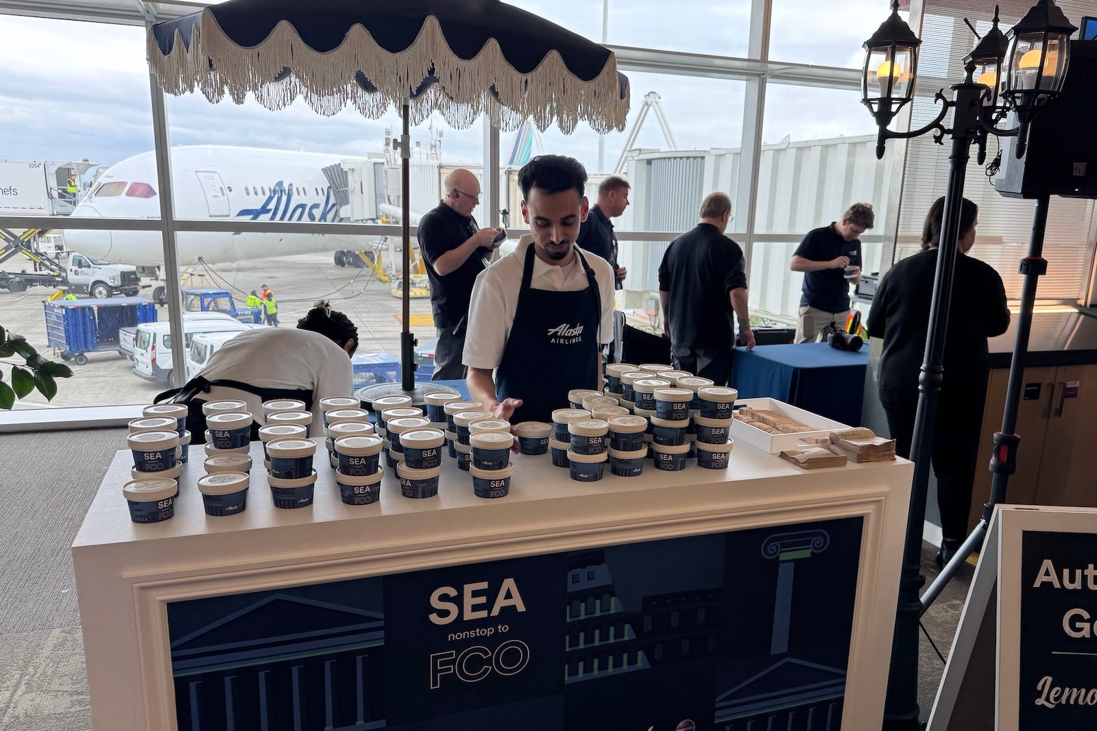 Down on the airport concourse — on this day, at least — music blared, passengers scooped up spoonfuls of gelato and Alaska CEO Ben Minicucci helped serve up canolis ahead of the flight that would officially blaze Alaska’s trail to Europe (I wouldn’t expect the latter on any future flights, to be clear).