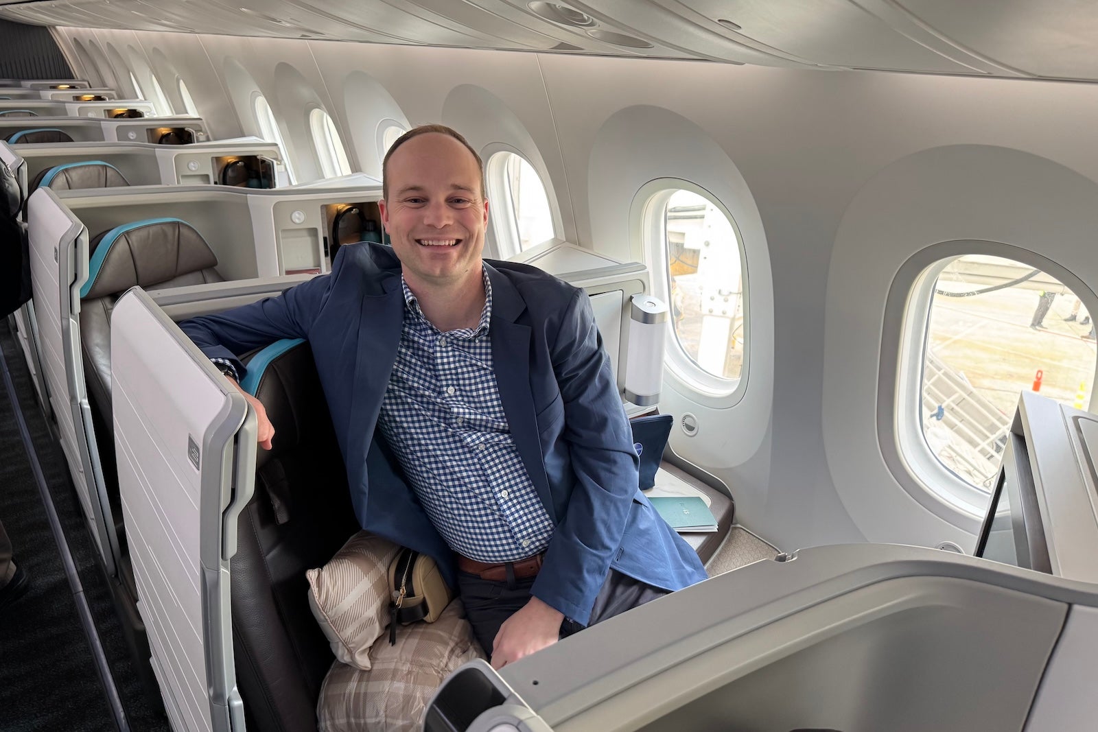On board, one thing is obvious: This is very much the same (beautiful) Dreamliner that Hawaiian debuted in 2024. Look no further than the blue, coral-inspired seat coverings.