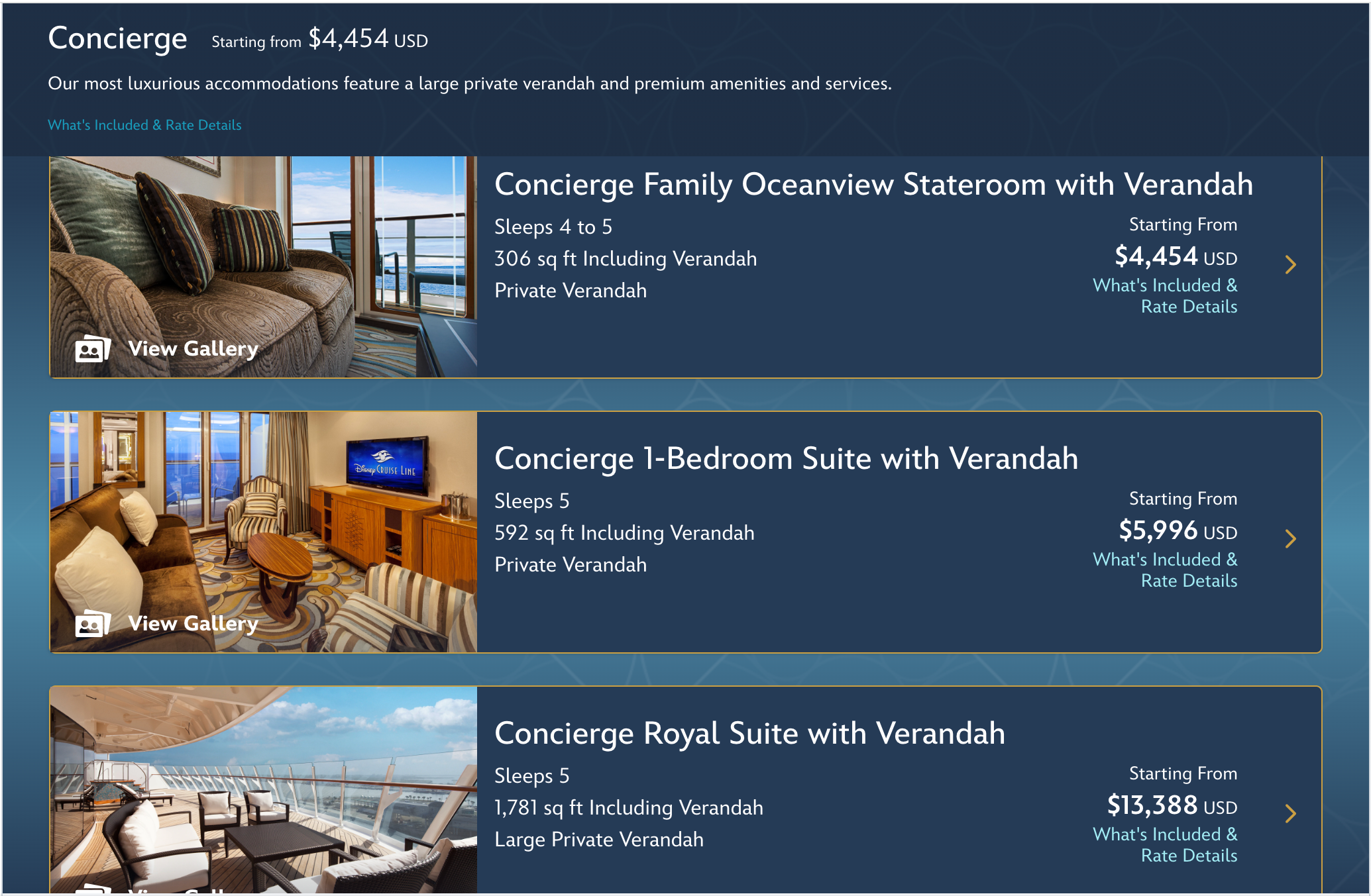 When I recently priced out Disney Cruise Line concierge rooms, cruise fares for ships departing from the U.S. started at a little under $4,000 for a short sailing for two people during the less busy cruising times. On short sailings from places like Singapore on Disney Adventure and when one of the Disney ships is operating short sailings out of Australia, the starting price for the concierge level can drop a bit lower than that.