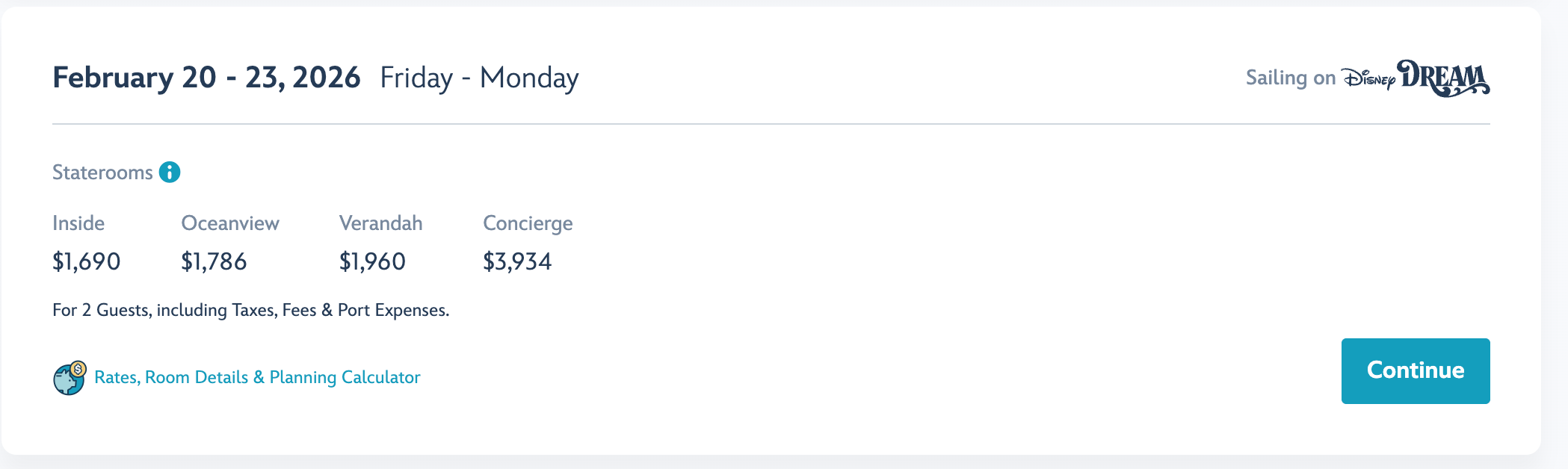 Currently, prices for a three-night Disney cruise from Florida to the Bahamas (including a stop at Disney’s newest island destination, Lookout Cay at Lighthouse Point) can start around $1,690 for double occupancy or $2,937 for a family of four in a windowless inside cabin. On the same cruise, a nonconcierge balcony cabin starts at $1,960 for two or $3,237 for four.