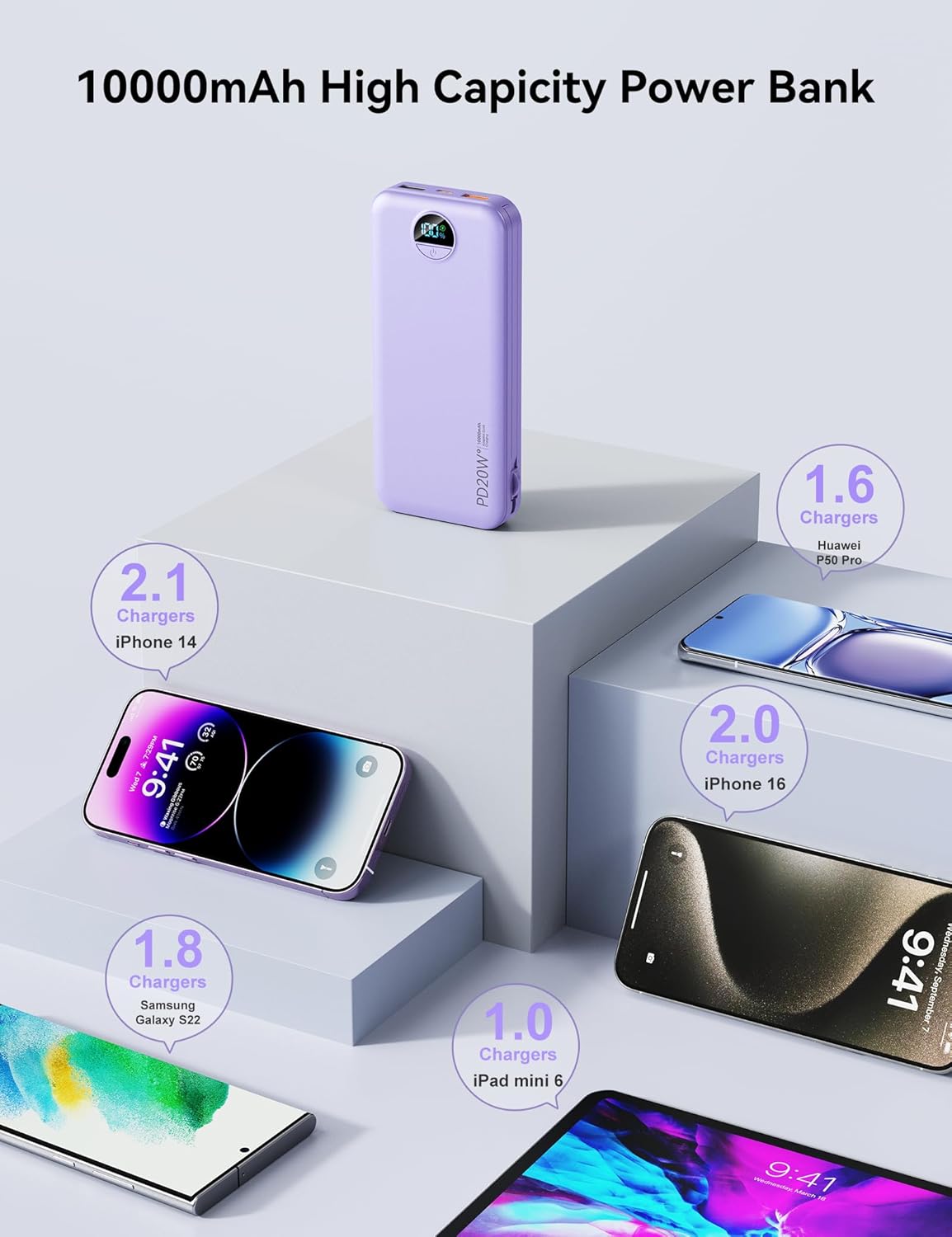 【10000mAh High Capicity】10000mAh portable battery can charge for iPhone 15 about 1.8 times, for Samsung Galaxy S22 about 1.8 times, for Huawei P50 Pro 1.9 times, for tablet mini 4 about 1.1 time,power for the whole day. Don’t let a low battery interfere with your travel pleasure.