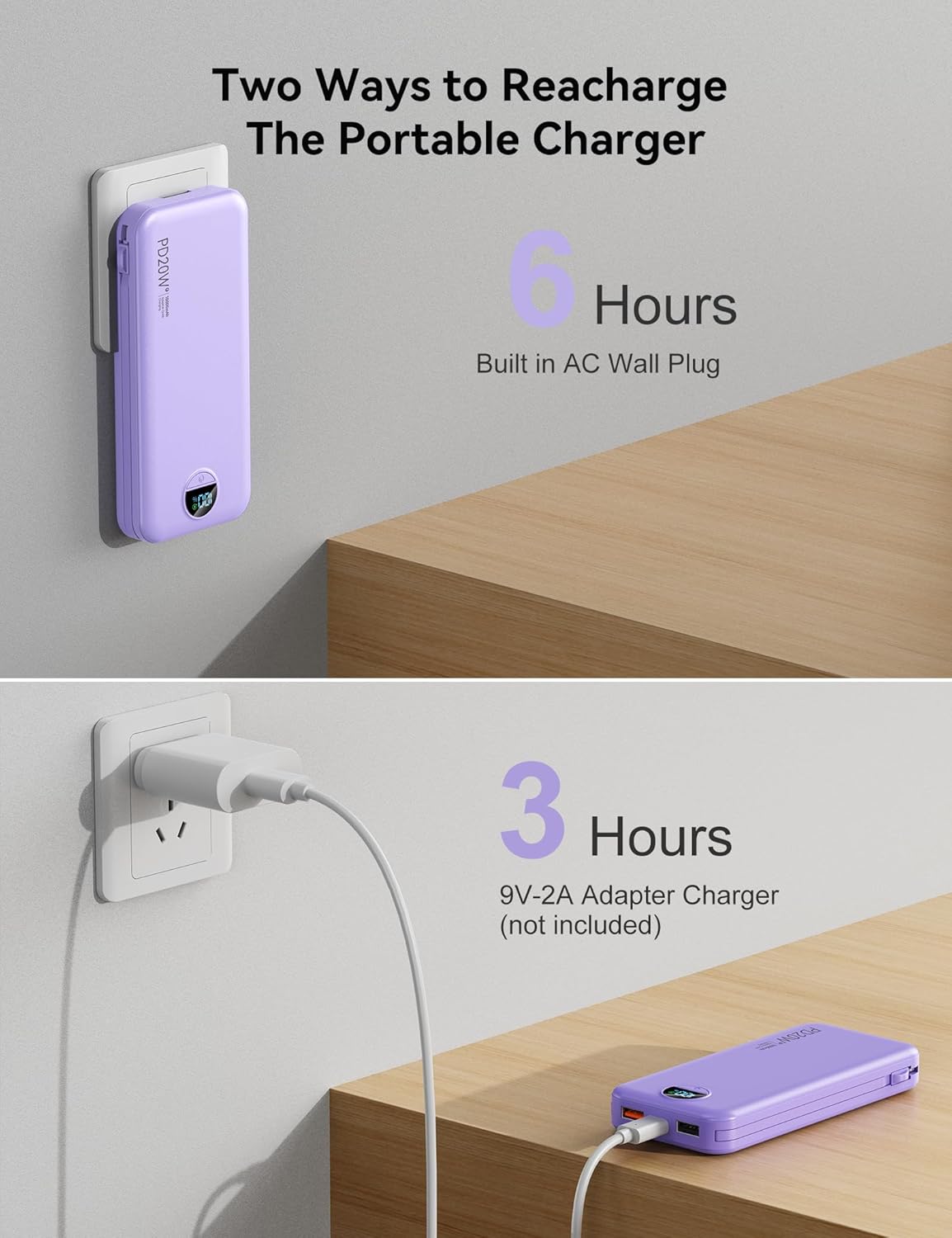 【Two Ways to Recharge The Portable Charger】It will be fully charged within 6 hours through the AC wall plug. Using the USB C charging port, you only need 3 hours for fully charging.Equipped with an intelligent LED display, you can always know the remaining charge level of the portable power bank.