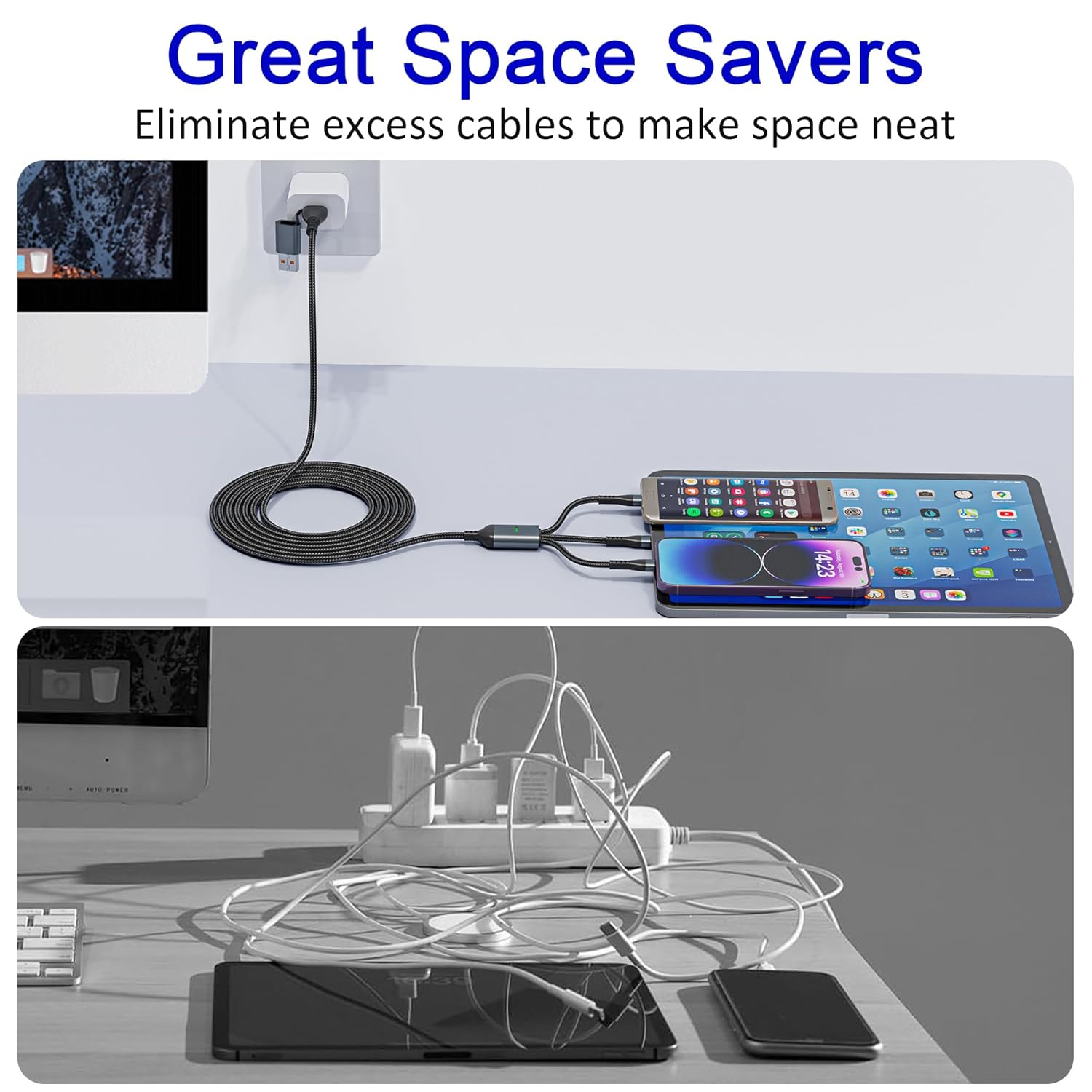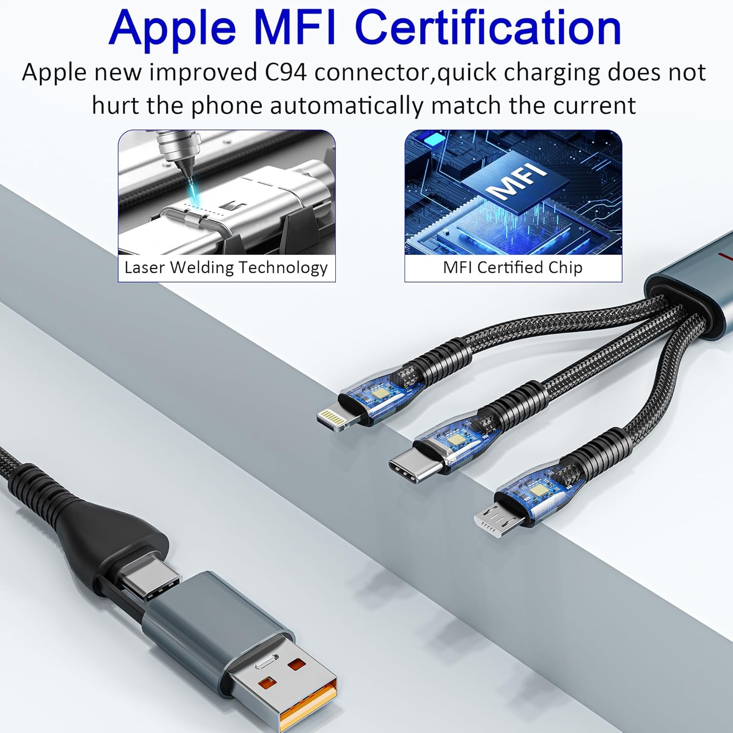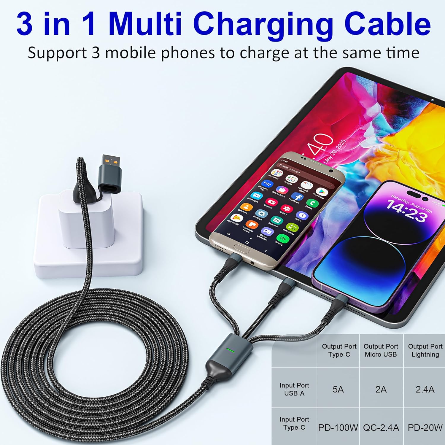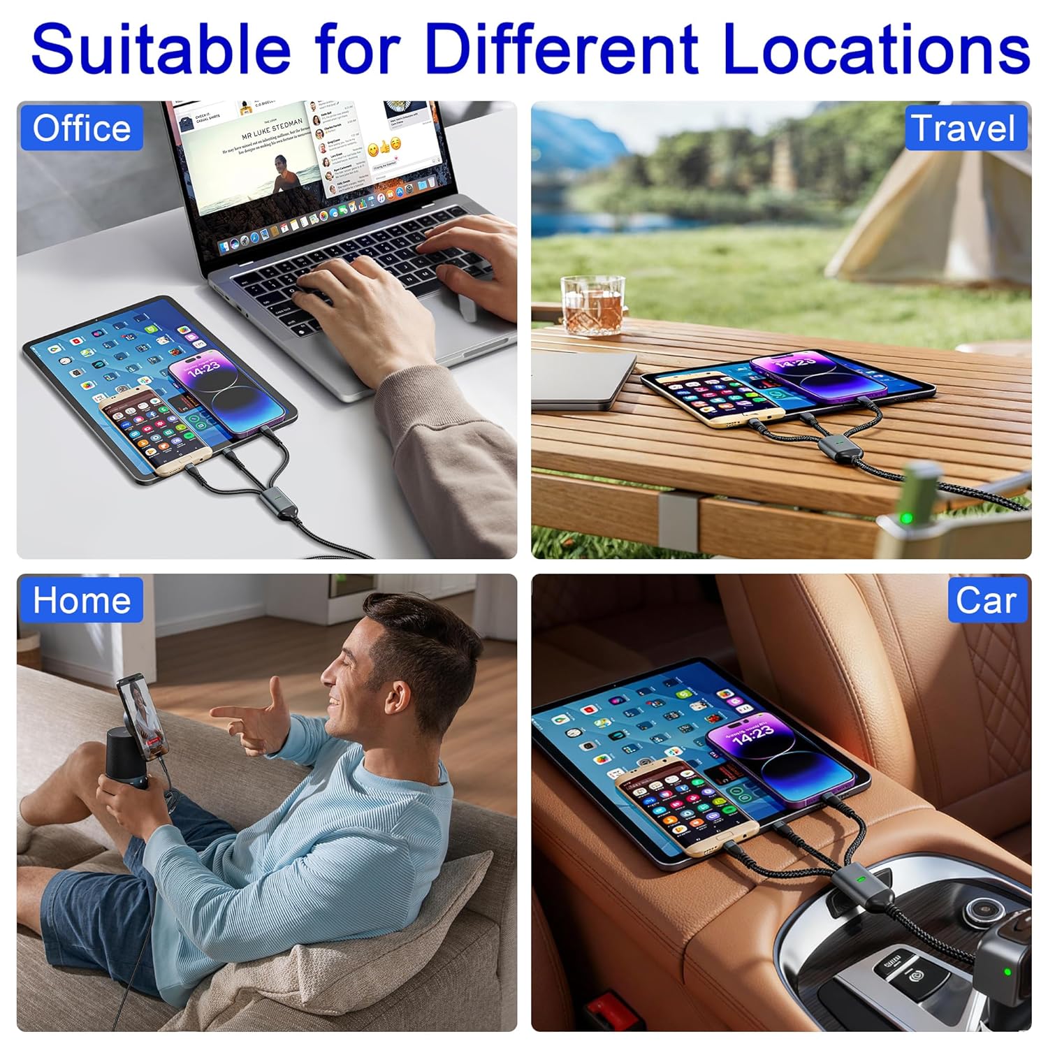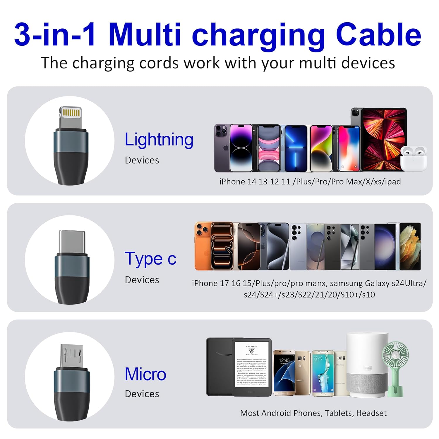 💻【Universal Compatibility & High-Power Charging】Compatible with a vast range of devices:Type-C: Ideal for iPhone 17/16/15, iPads, tablets, laptops, and other larger power-requirement devices. Lightning: MFi Certified for iPhone 14/13/12/11, iPad Air/mini. Micro-USB: Perfect for Android phones, Bluetooth headsets, and more. Please Note: The Type-C port is designed for high-power devices. An iPad or laptop cannot be charged simultaneously with other devices on this cable, and your charging adapter must support the PD protocol for optimal performance