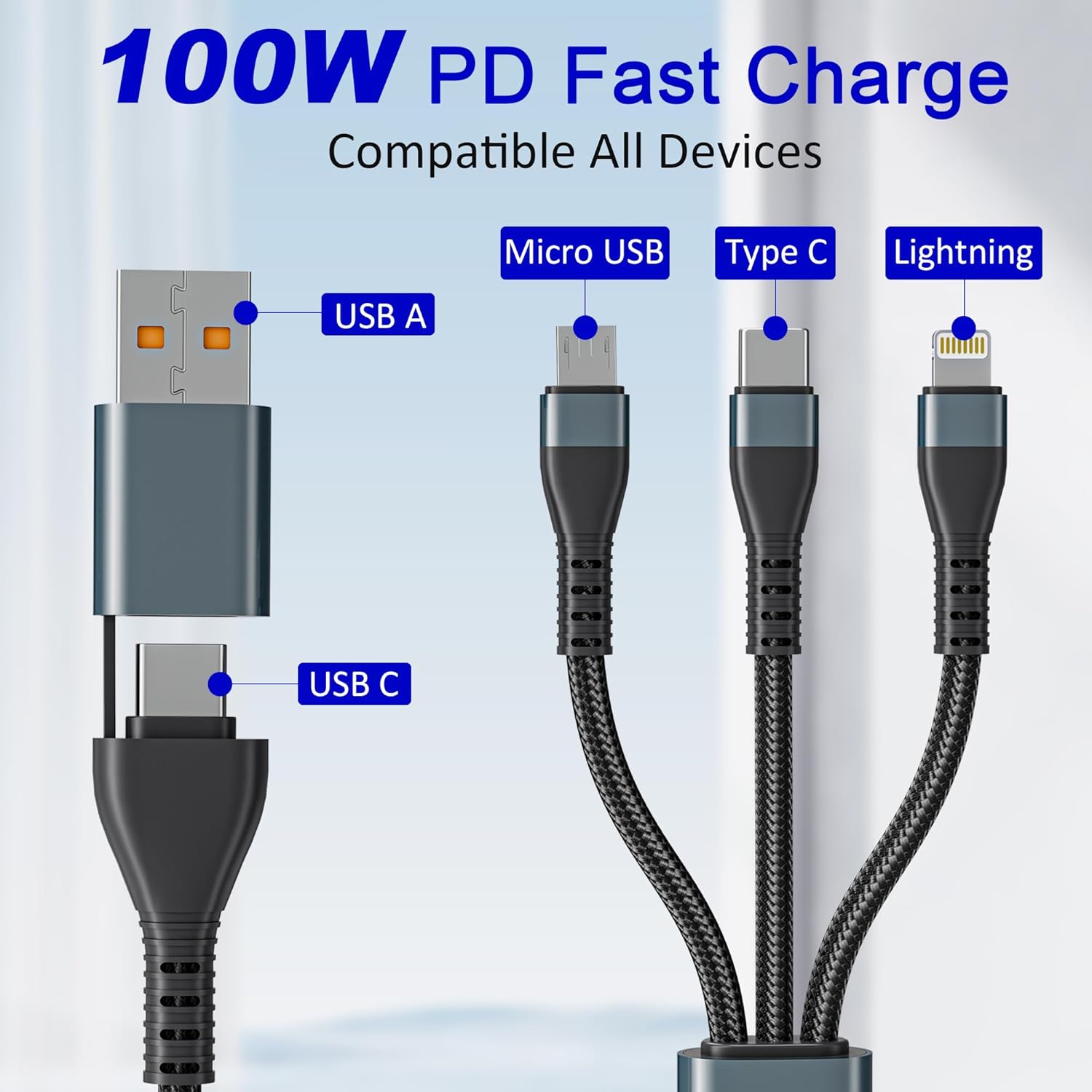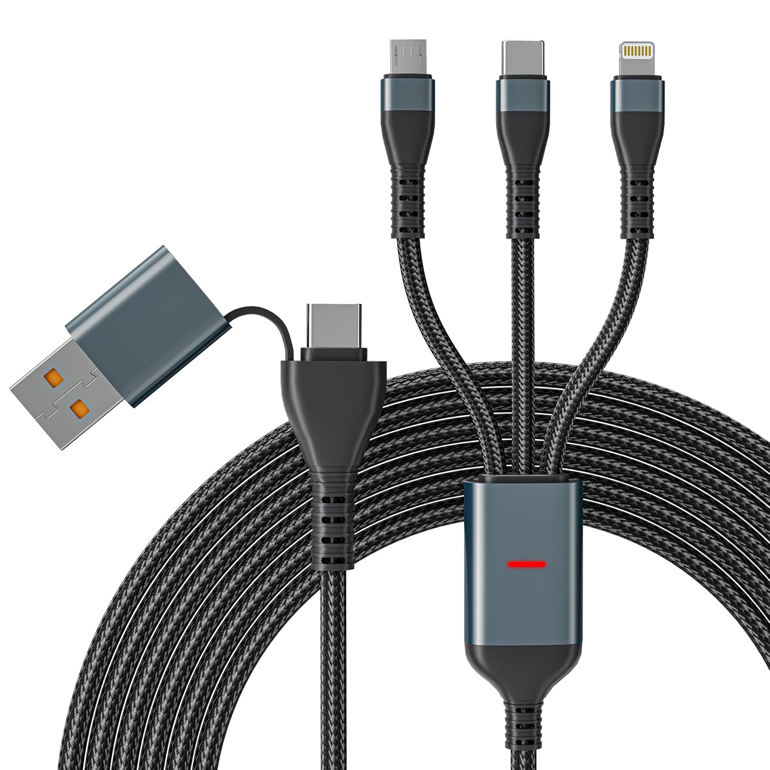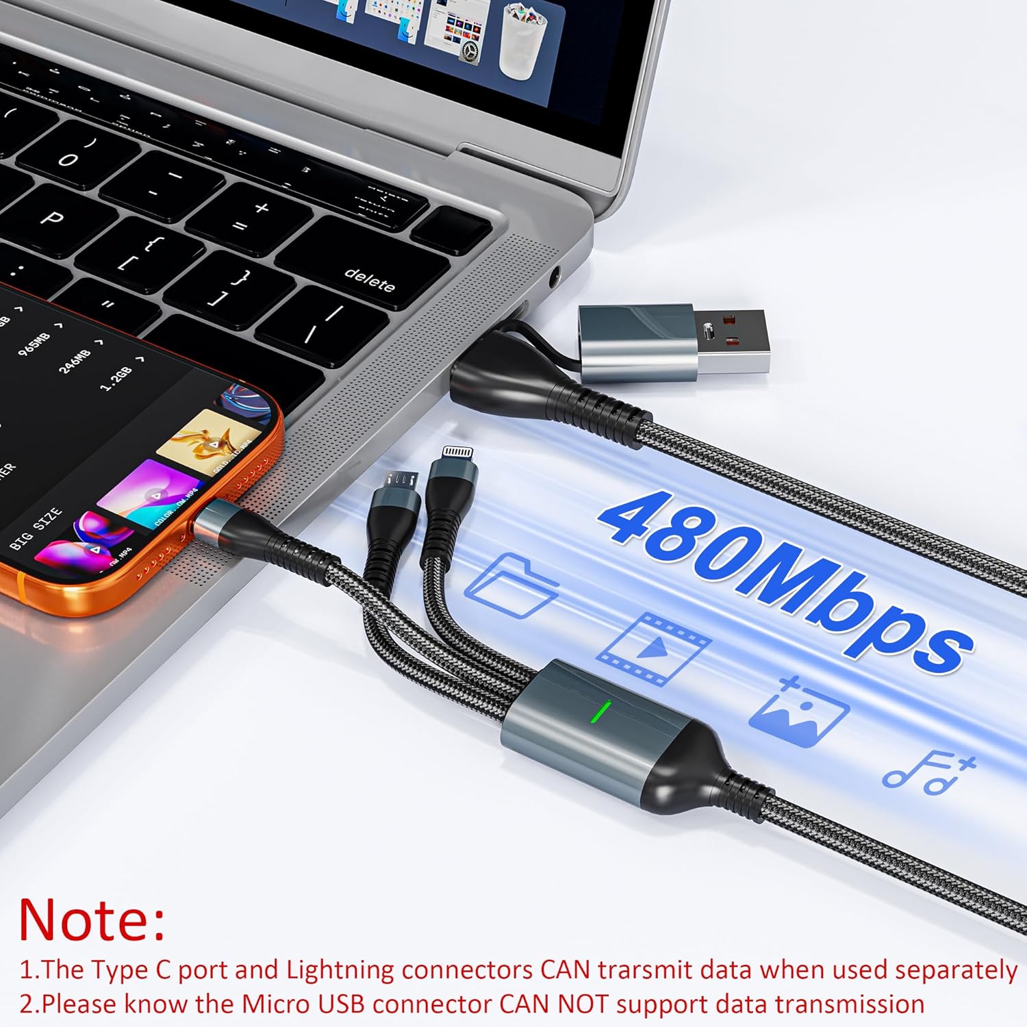 🔌【5-in-1 Versatile Design & Smart Data Usage】This all-in-one cable features a 2-in-1 input (USB-C/USB-A) and 3 output connectors (Lightning/Type-C/Micro USB), replacing a tangle of cables. Important Note: Only type c and Lightning heads of this cable can transmit data when used separately; when using two connectors, the latest used one will be recognized first to transmit data. (Micro connector can not support data transmission)