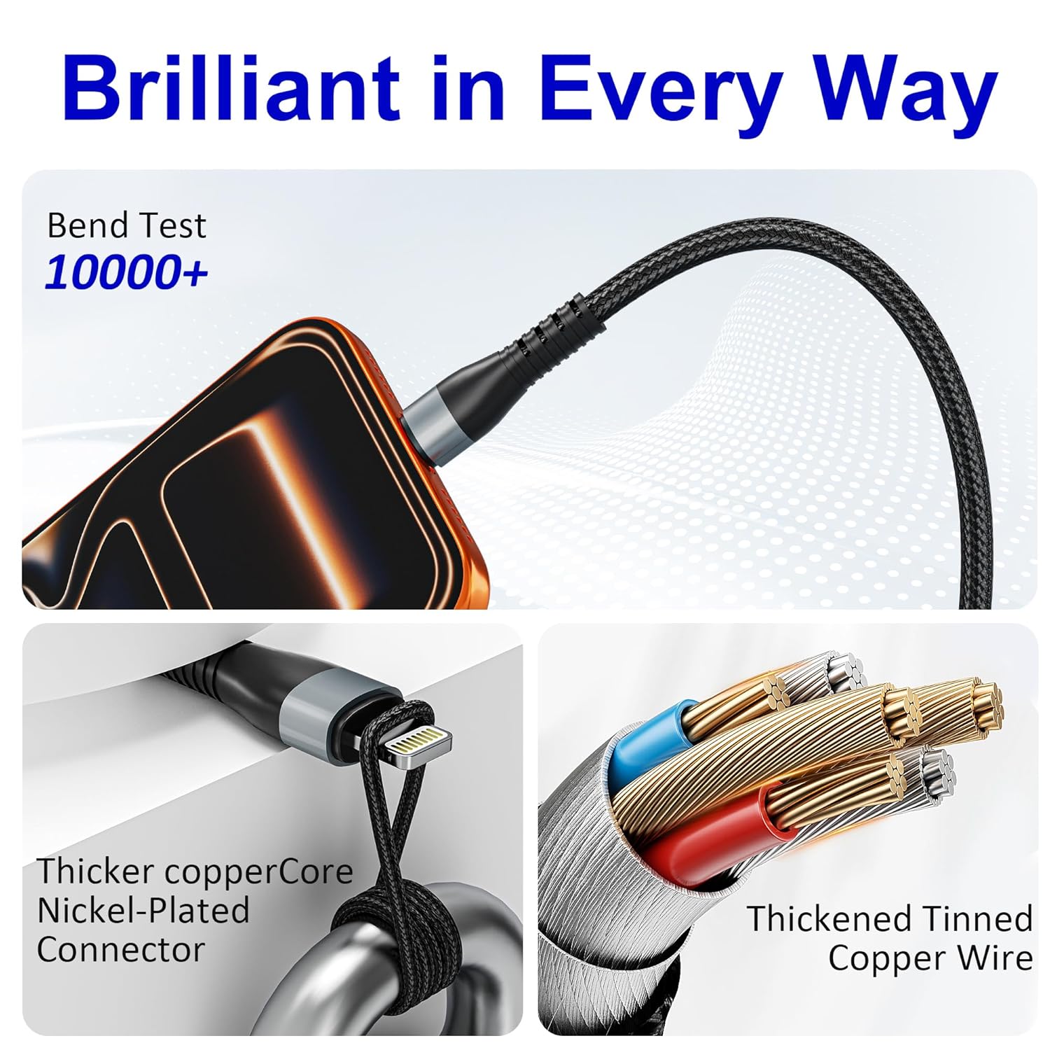 🔒【MFi Certified & Enhanced Durability】Apple MFi certification guarantees 100% compatibility with iOS devices, ensuring safe, fast charging without pop-up warnings. Built to last with high-purity copper cores, triple shielding, and connectors tested over 10,000 times
