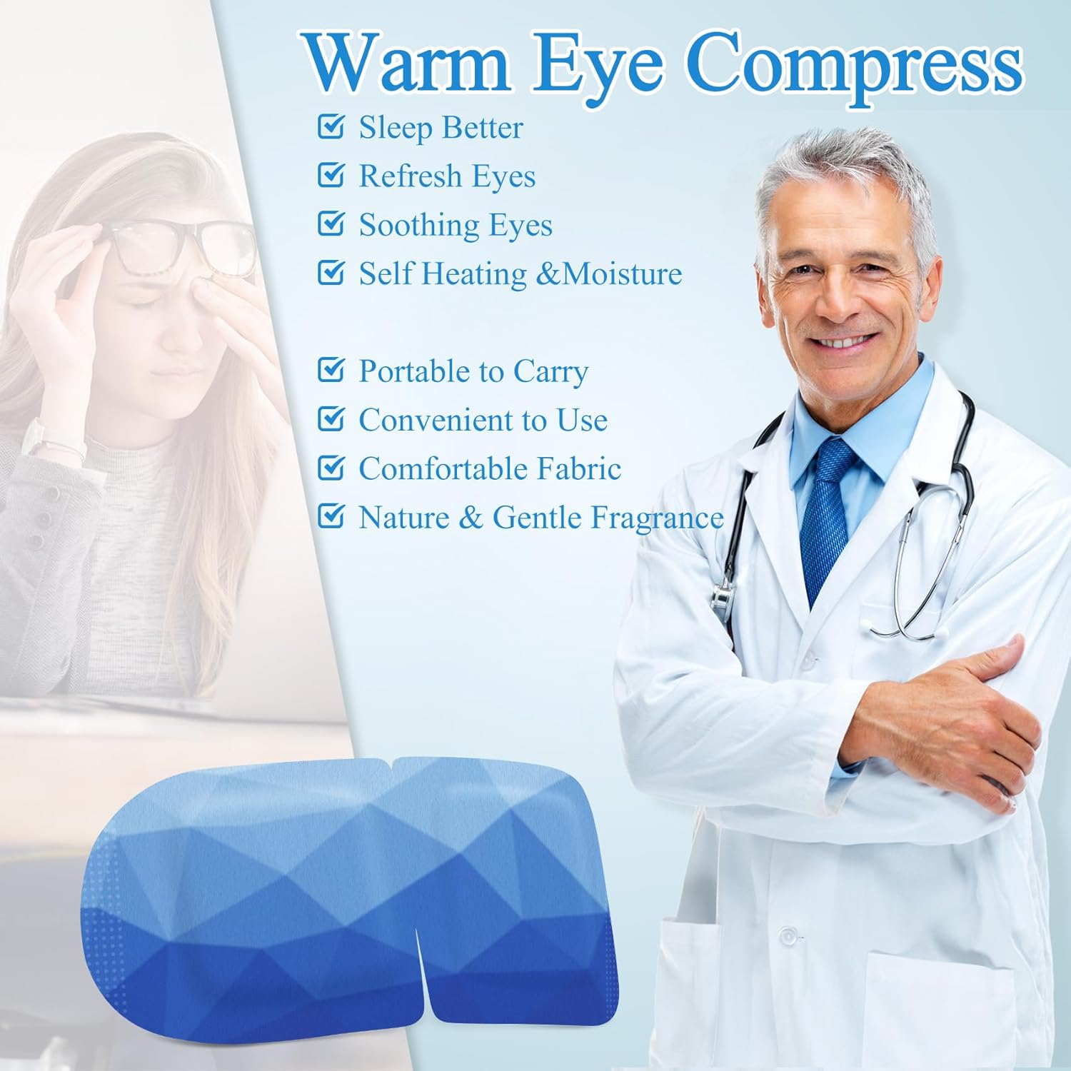 Moist Heating Eye Mask: Open the package, the steam eye mask will auto heat and releases moisture to keep warm and refresh your eyes, The warm compress heated eye mask helps to promoting better sleep quality.