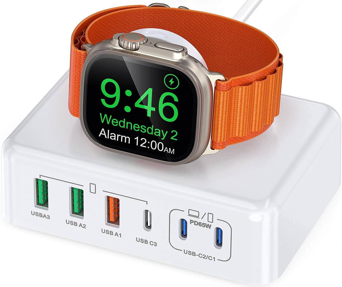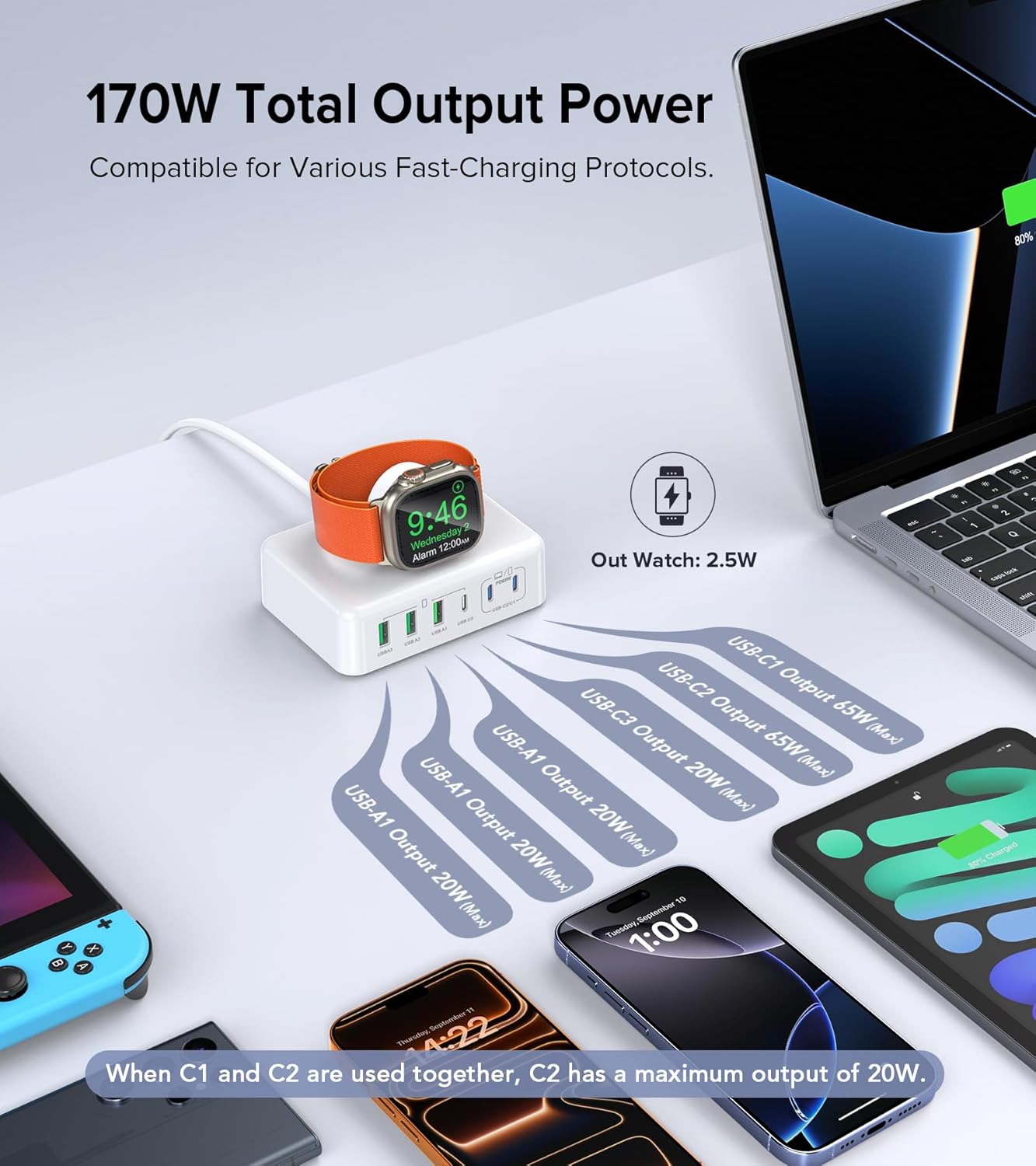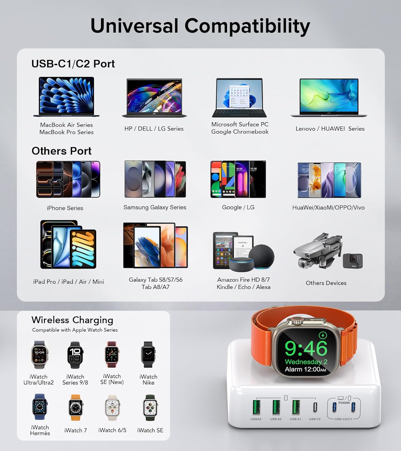 【USB C Fast Charging Station】This is a trendy multi-port USB C charger that can simultaneously charge 6 devices. Single-port USB C1/USB C2 can output up to 65W, and it only takes 2.5 hours to fully charge for MacBook Pro 16″. When using USB C1 and USB C2 at the same time, USB C2 outputs 20W Max, Super fast charging for your phone. USB C3 (Max 20W, PD3.0) and 3 x USB A (Max 18W, QC3.0) ensure the best charging effect for mobile phones, watches, earphones