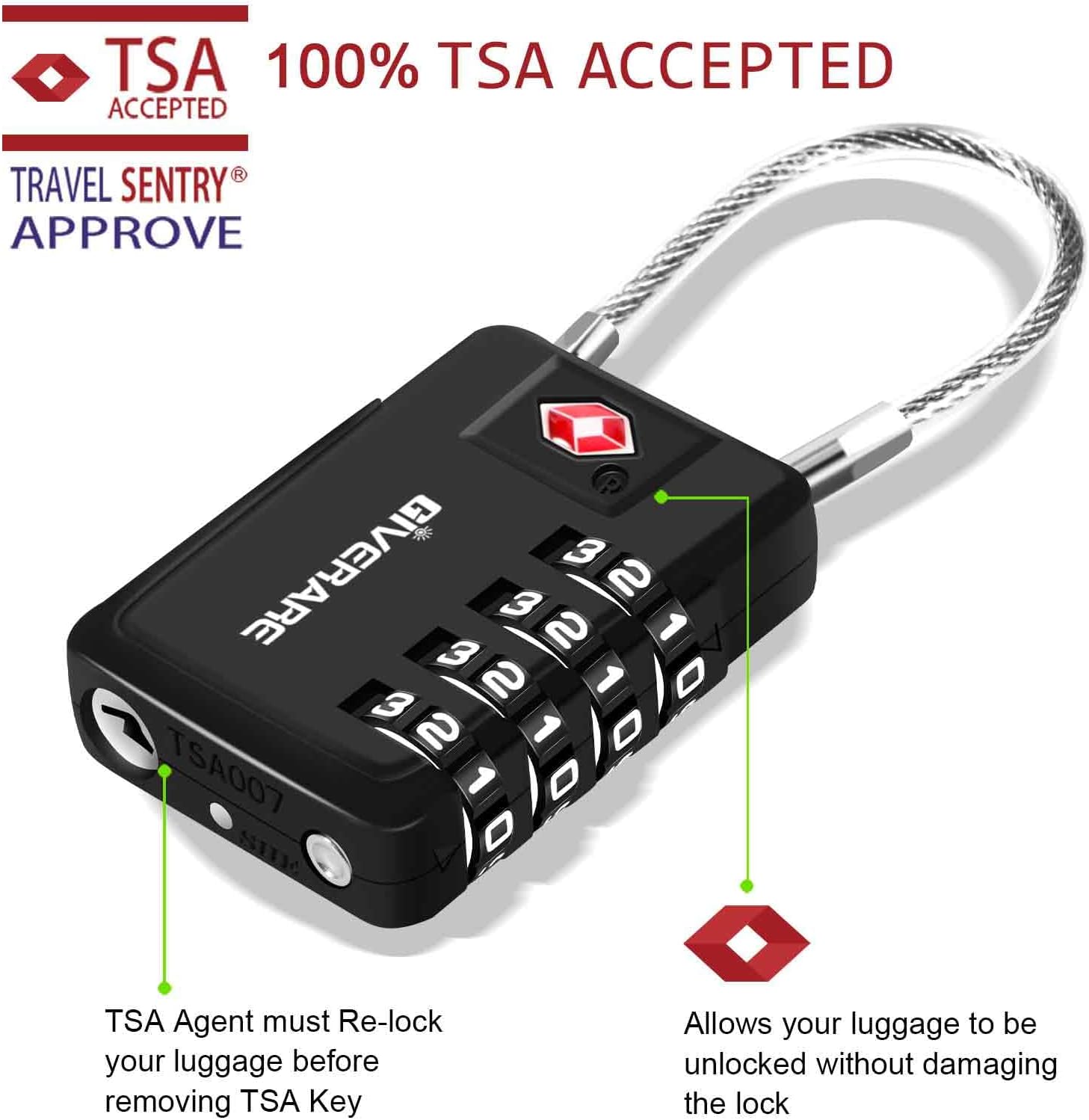 VERSATILE LOCK FOR ALL SITUATIONS: GIVERARE TSA cable padlock is perfect for indoor & outdoor use locking suitcase, hard case, gun case, briefcase, locker, purse, backpack, laptop bag and anything lockable, it locks your precious safely without any keys