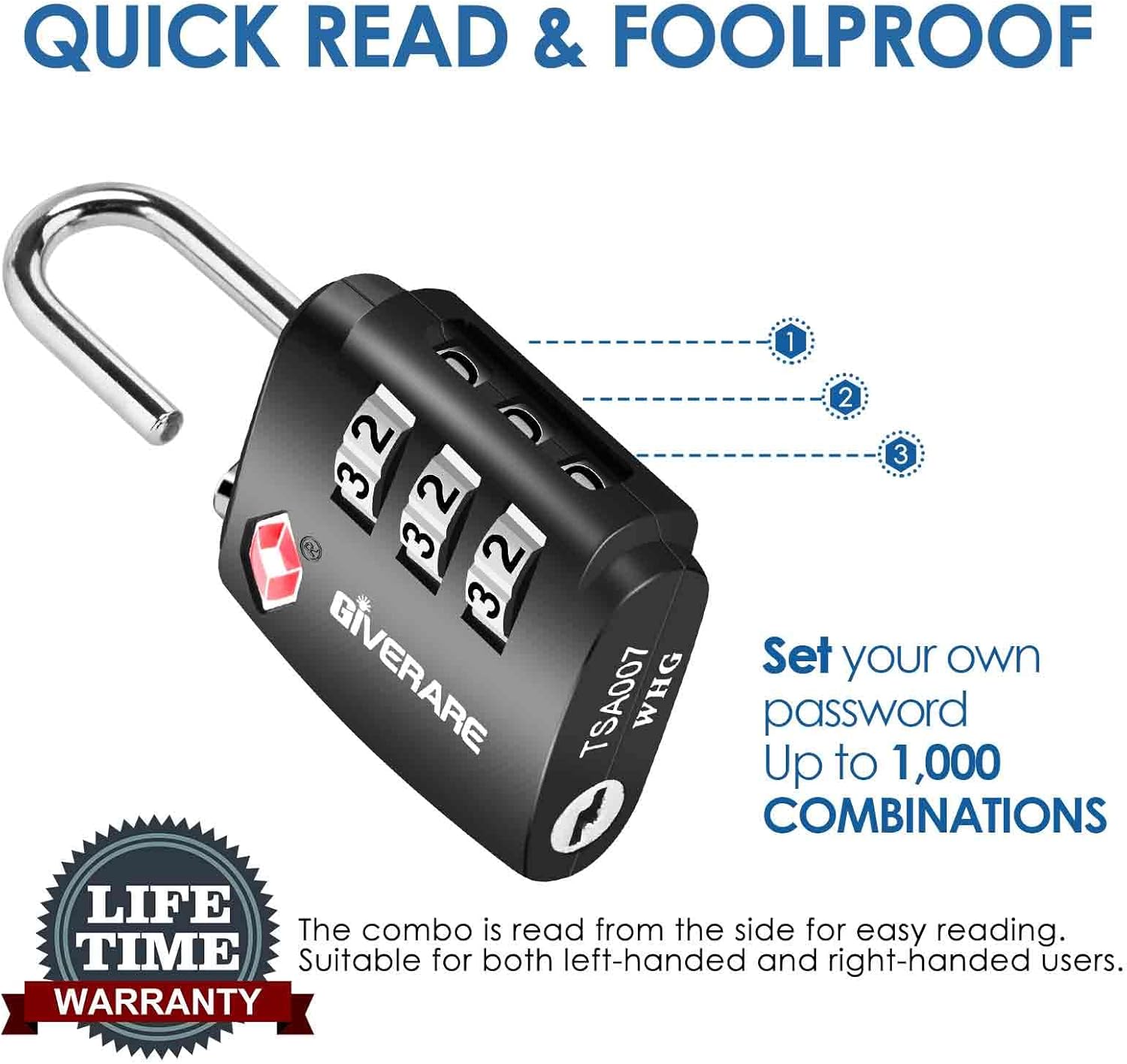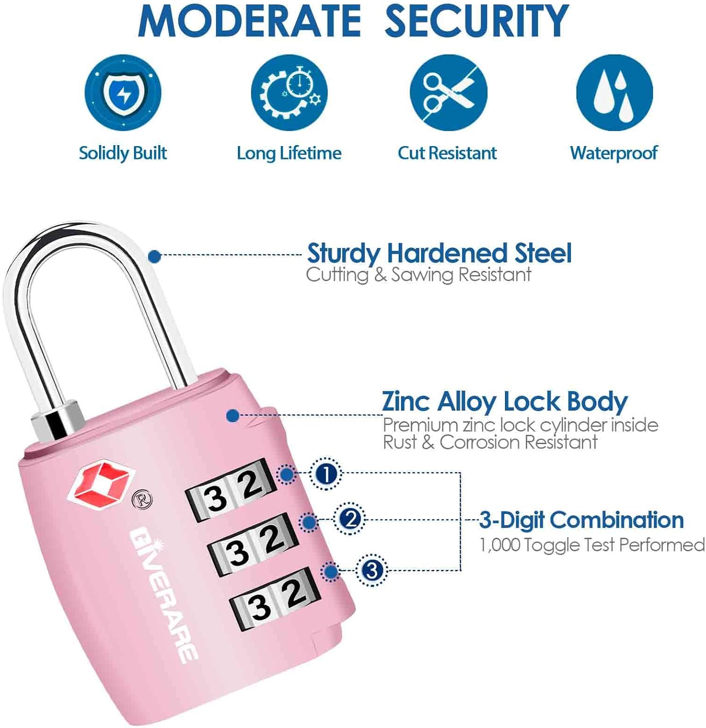 Allows TSA inspectors to inspect and re-lock baggage without damaging the lock. Help you enjoy your trip & business internationally through 750+ airports.Easy to set & read 1,000 combinations, the 0.15” sawing resistant sturdy steel shackle is suitable for almost all standard sized zippers and lock holes.Carefully zinc coated zinc alloy lock body & hardened steel shackle, wouldn’t rust or corrode, affords up to 220 lbs, can hardly damaged by human force.