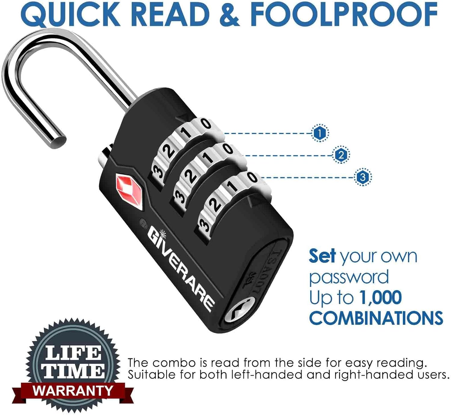 Allows TSA inspectors to inspect and re-lock baggage without damaging the lock. Help you enjoy your trip & business internationally through 750+ airports.Easy to set & read 1,000 combinations, the 0.15” sawing resistant sturdy steel shackle is suitable for almost all standard sized zippers and lock holes.Hardened steel shackle & lock cylinder with the sturdy high-impact ABS housing, affords up to 220 lbs, can hardly damaged by human force.
