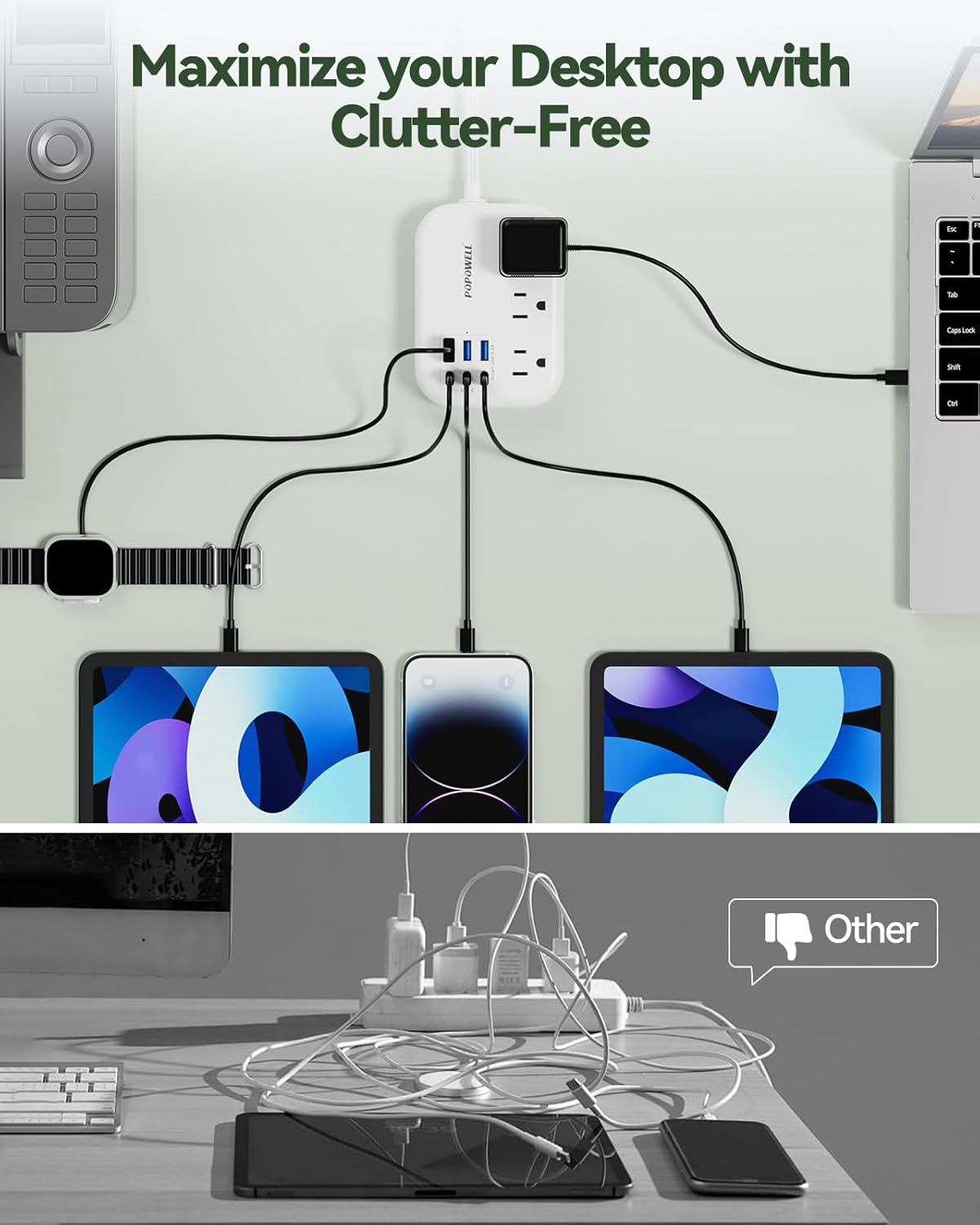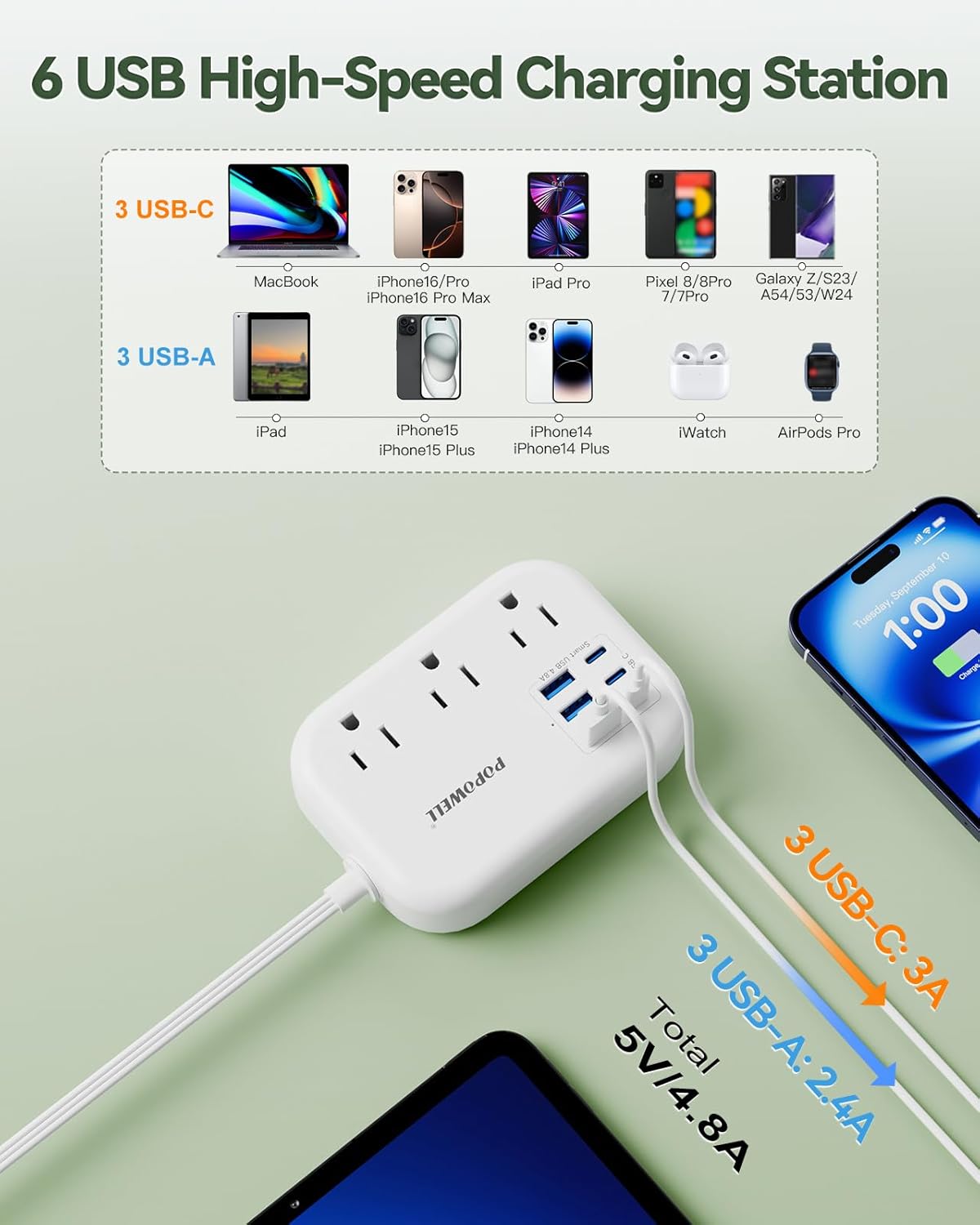 【6 USB High Speed Charging Station】-3 USB C port provides 5V 3A 15W,6 USB ports Output 5V 4.8A-24W Max. Compare with other power socket,this usbc power strip provide 3 usb and 3 usb-c fast charge for Iphone 16,with Smart-IC Technology, It will identify your devices automatically and deliver the most suitable charging speed for your electric devices.Maximum expand your devices on desktop, office,Travel,cruise ship essential.
