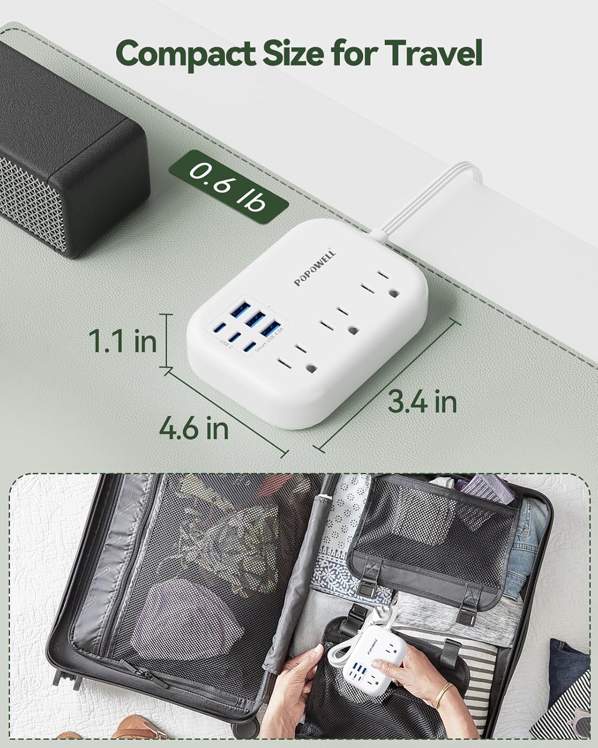 【Travel Power Strip with USB ports】-This small power strip including 6 powerful USB ports to meet your multiport charging demands,make this USB C Outlet Extender charge up to 9 devices at the same time. The power strip with usb supports a maximum power of 1250W (125V~10A) and USA Volatage from AC(100-125V)