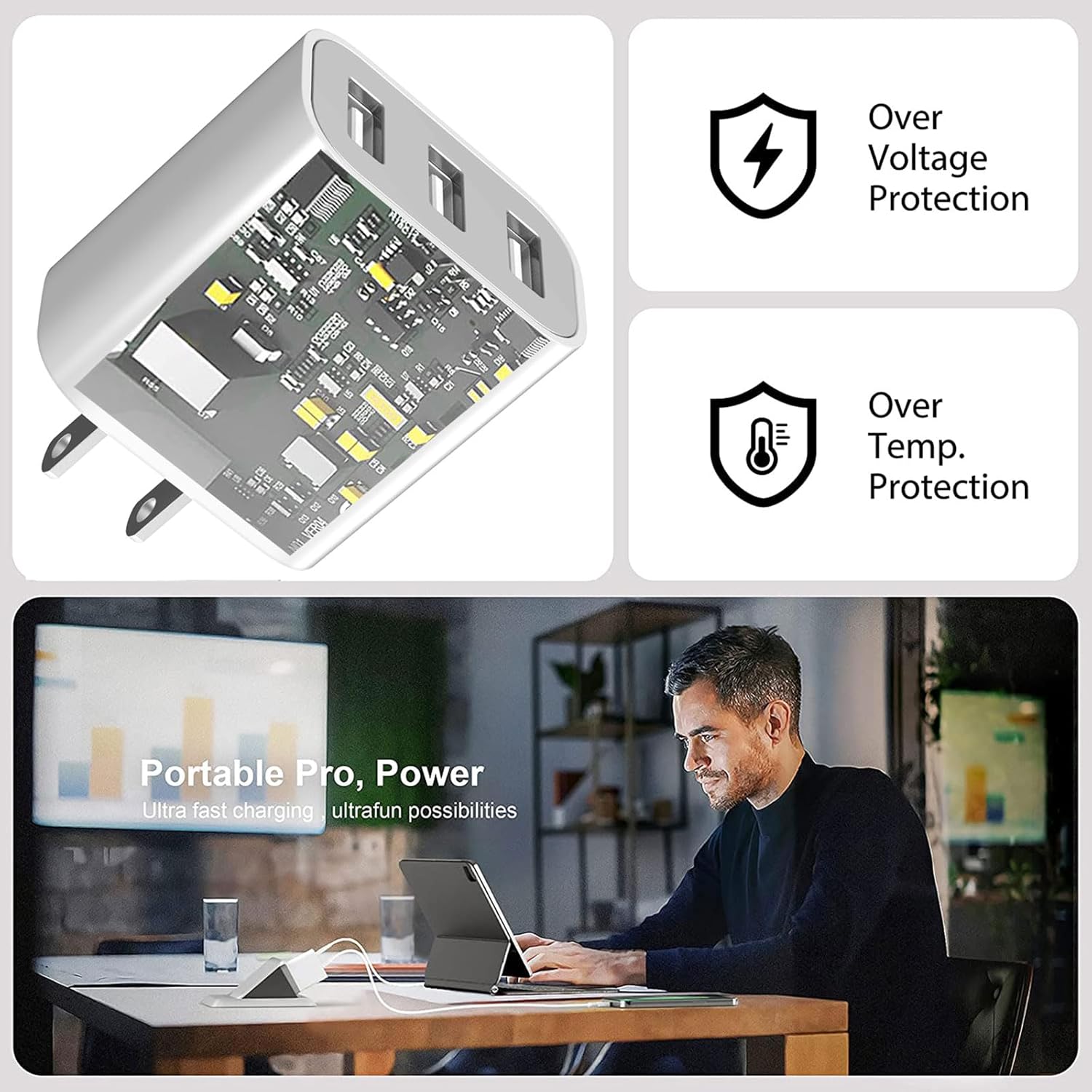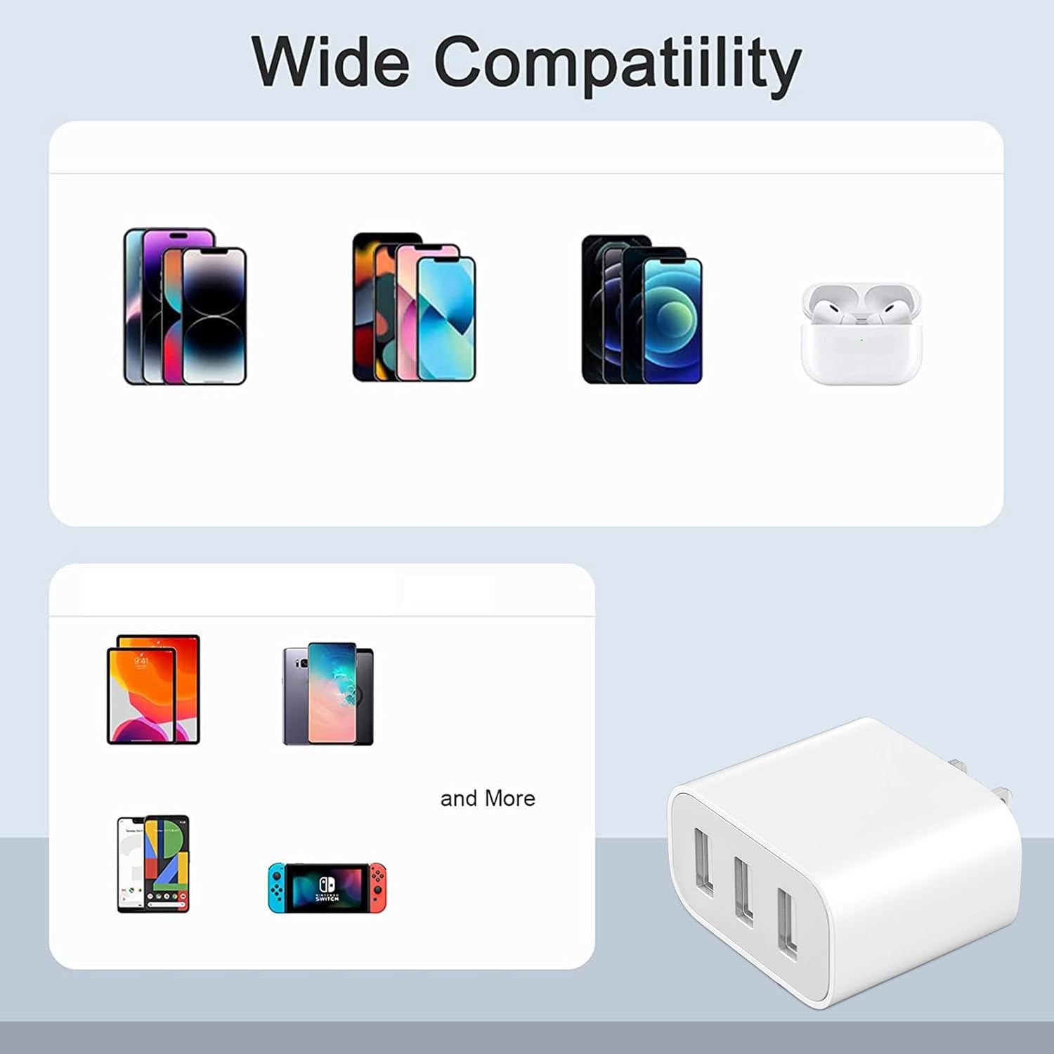 Universal Compatibility:This is a 3-port USB charging cube that works universally for nearly all devices. The usb wall plug is compatible with iPhone 14/13/12/11 Pro Max, Mini, SE, XR, XS MAX, XS, X, 8 Plus, iPad Pro, iPad Air, iPad mini, Samsung Galaxy and more USB-ported devices