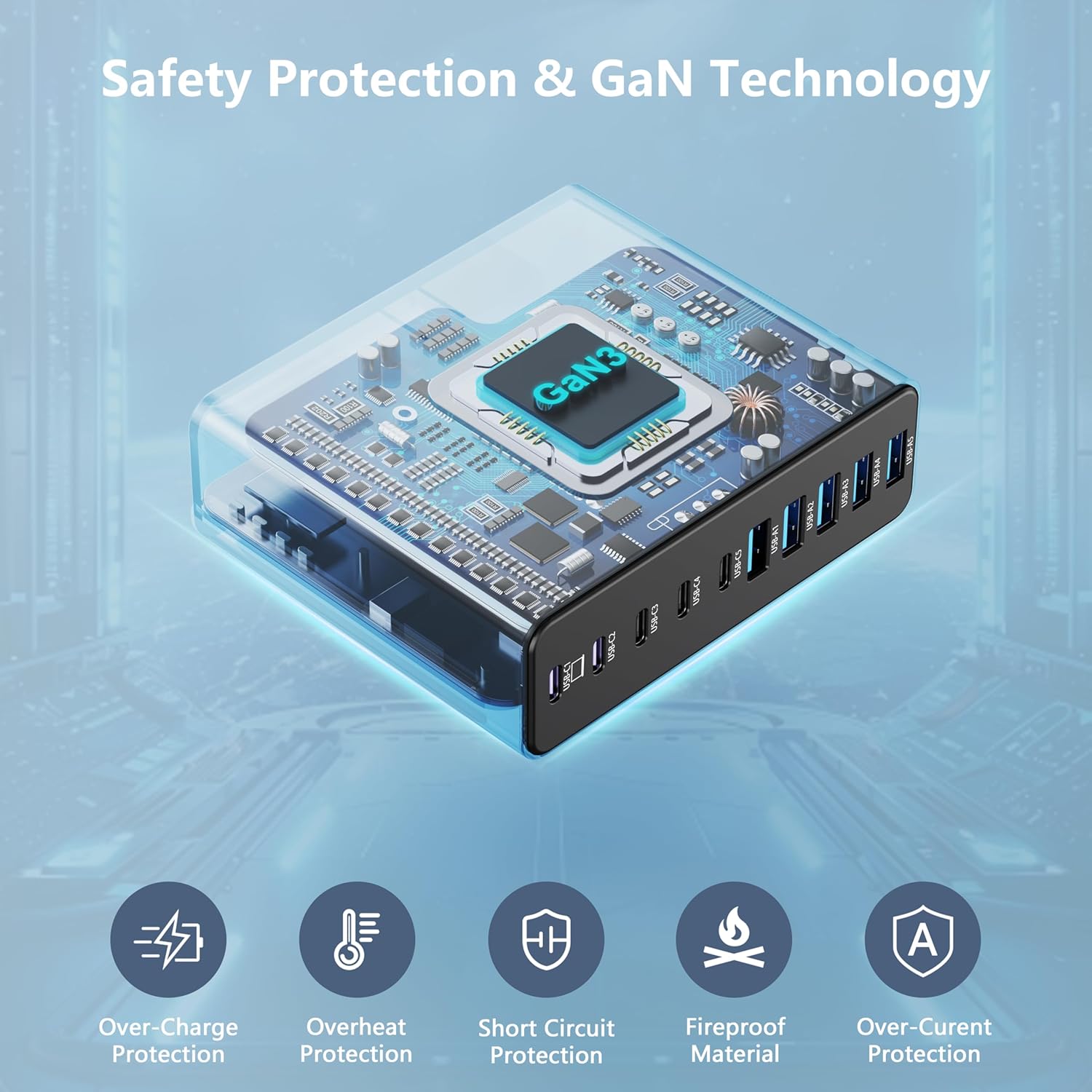 Multiport USB-C & A Charging Station: Boasting to charge up to 10 devices at once, this versatile charging block features 5 USB-C ports and 5 USB-A ports. The dedicated USB-C port powers newer electronics like laptops, while the legacy USB-A ports support older devices. Unlike most chargers with false advertising and outputs that slow down when multiple ports are used.