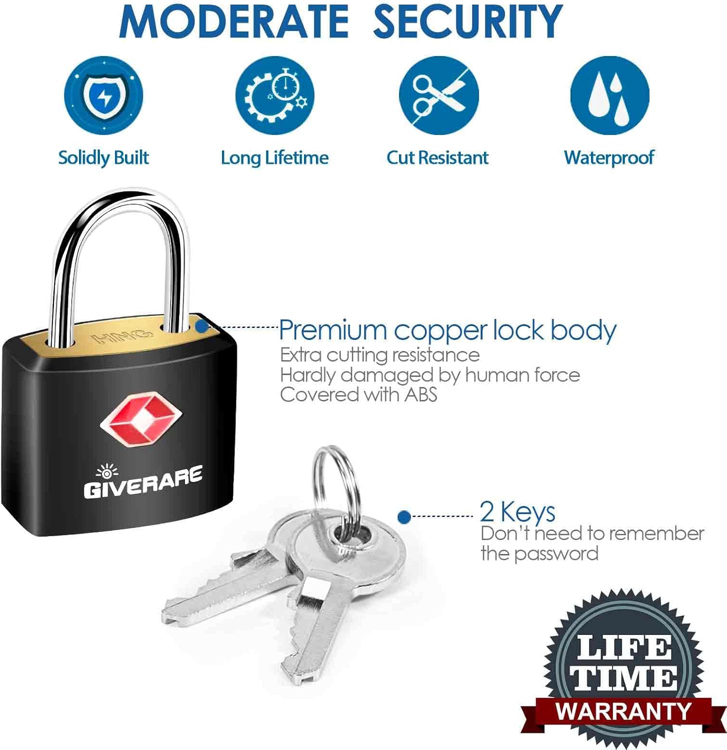 TSA Approved Premium copper lock body 0.12” hardened steel shackle Extra cutting resistance Suitable for different situations Patented internal mechanisms Waterproof, quality plastic shell 4 classic padlocks + 8 keys