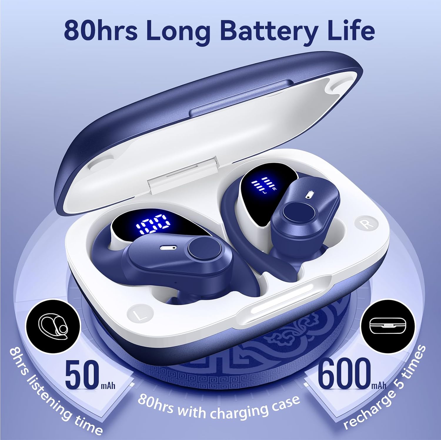 80Hrs Battery Life with Power Display Case: Keep your music, calls, and podcasts going through long commutes, intense workouts, or travel adventures. Each earbud provides up to 8 hours per charge, while the 600mAh charging case extends total playtime to an incredible 80 hours. Quick-charge 10 minutes gives 2 hours instantly, and the dual LED display shows real-time battery for both bluetooth headphones and case, so you stay powered and worry-free all day.