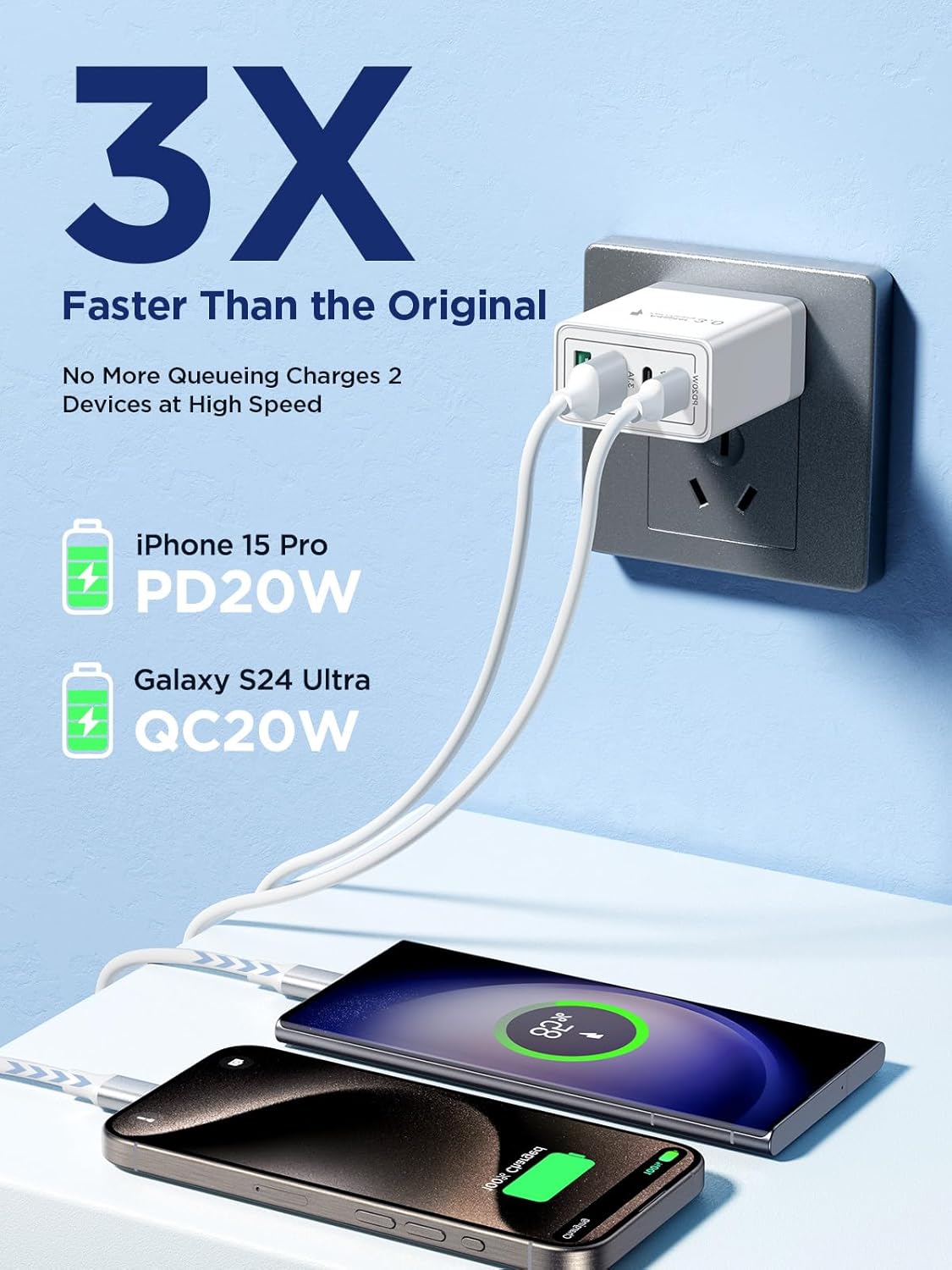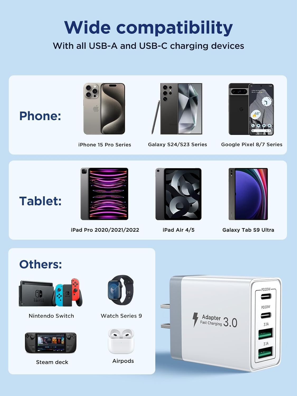 【For All Your Devices】: The Charging Block compatible with All smartphones and tablets, such as iPhone 17/17 Pro/17 Pro Max/17 Plus/16/15/14/13/13 Pro/13 Pro Max/13 Mini/12/12 Pro/12 Pro Max/12 Mini/11/11 Pro/11 Pro Max, iPhone XS/XS Max/XR/X, iPad, iPad Pro, iPad Air, iPad Mini, Samsung Galaxy S22/S21/S20/S10/S9/S8/A12/A13/A22/A32/A52/A53/A71/Note 20 10, LG, Google Pixel, Kindle Fire, Tablets, etc. Cell phone wall chargers compatible with usb-c to lightning cables.
