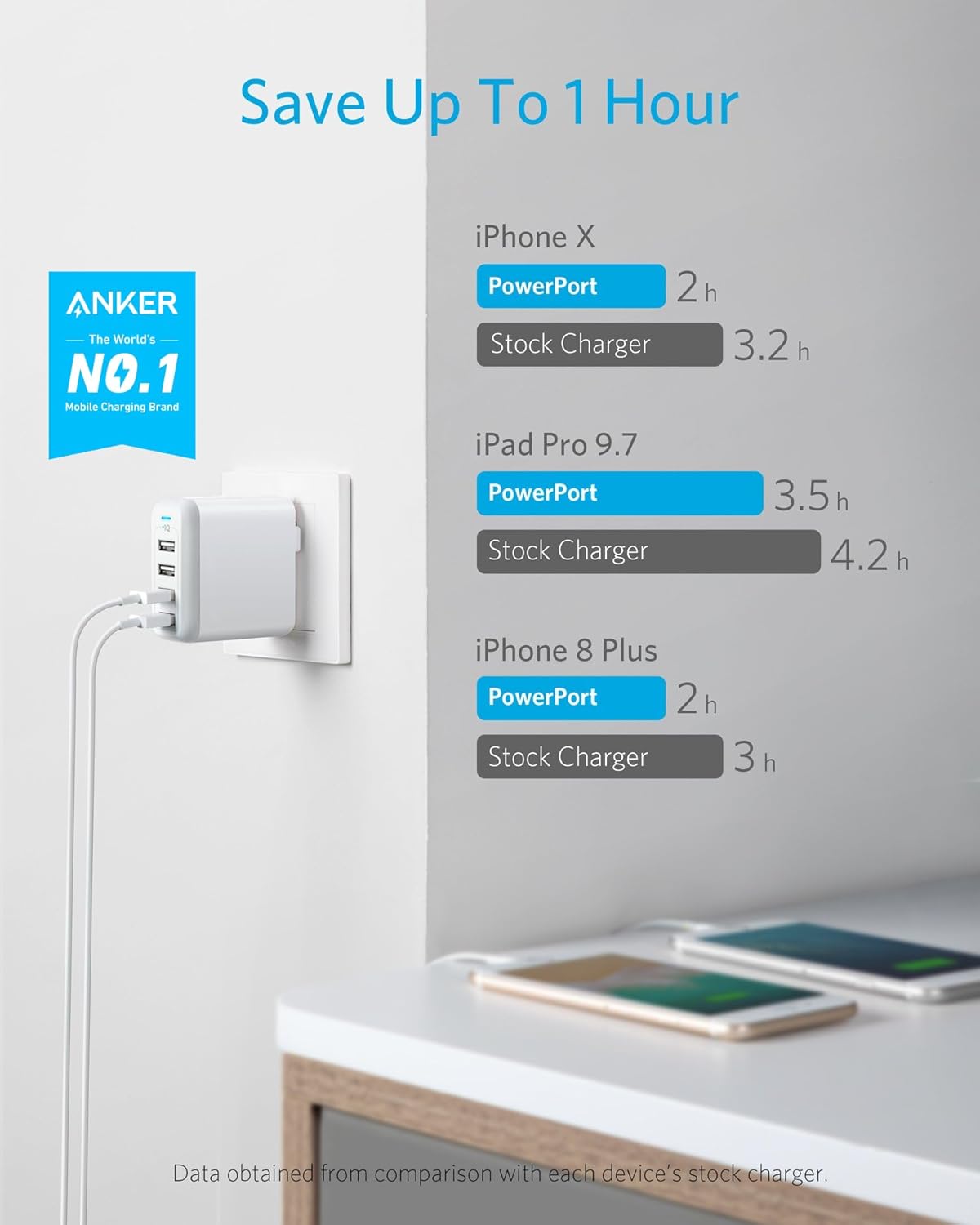 “Anker PowerPort 4 40W 4-port USB charging hub for phones, tablets & more Media’s Choice Recommended by the Wall Street Journal, which remarked that “PowerPort 4 was a godsend.” Advanced Charging Technology Exclusive to Anker, PowerIQ and VoltageBoost combine to ensure your devices charge at their their fastest possible charge speed. Ultra Powerful 4 ports pump out 40 watts of power, enabling multi-device charging. Simultaneously charge two iPads and two iPhones at full speed! MultiProtect Safety System Surge protection, temperature control and more advanced safety features keep you and your devices safe. Super Compact As small and light as a MacBook Air power adapter, the Anker PowerPort 4 is one of the most compact multi-port USB chargers on the market. World Famous Warranty At Anker, we believe in our products. That’s why we back them all with an 18-month warranty and provide friendly, easy-to-reach support. For Optimal Use: Use your original cable or a third-party certified one (such as MFi). Compatible with Apple and Android smartphones, tablets (including the Nexus 7) and other USB-charged devices. Note: If a port isn’t working properly, your device may have triggered the protective internal safety switch. In order to reset the switch, unplug all cables for five minutes and retry. This charger is not compatible with the iPod nano, iPod Classic, iPod Shuffle, HP TouchPad and Asus tablets. We recommend charging your MacBook while it’s turned off or in sleep mode (5-hour recharge time). “
