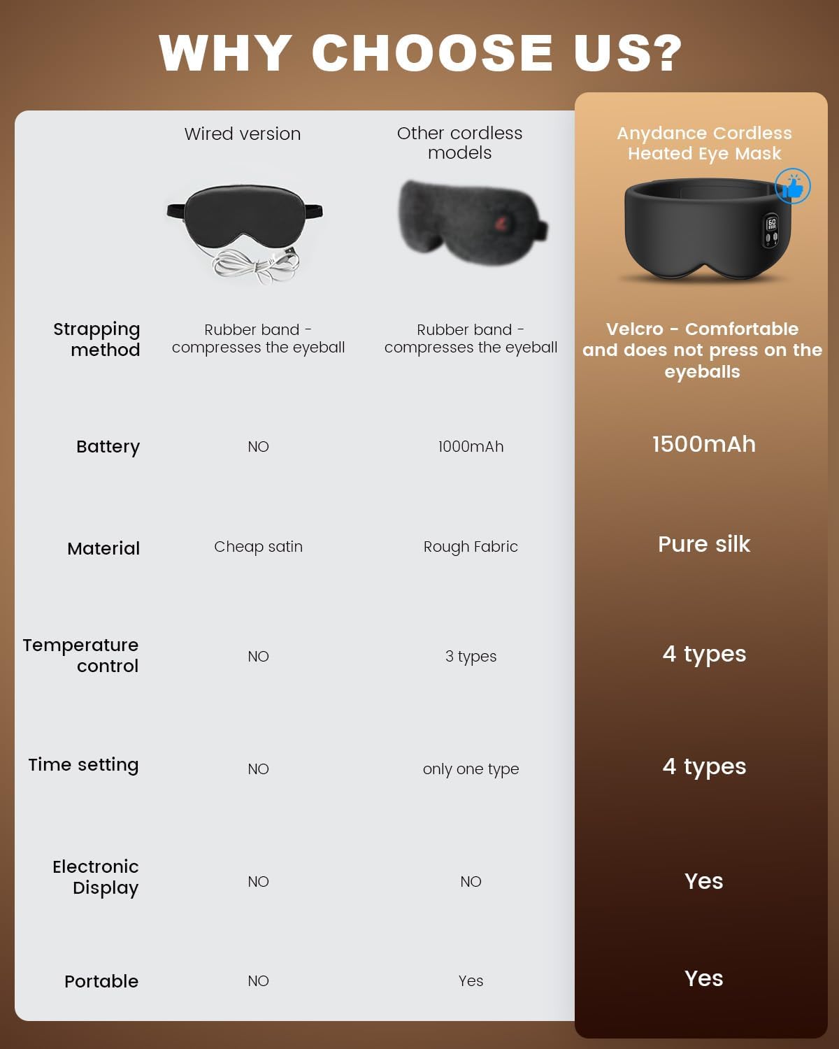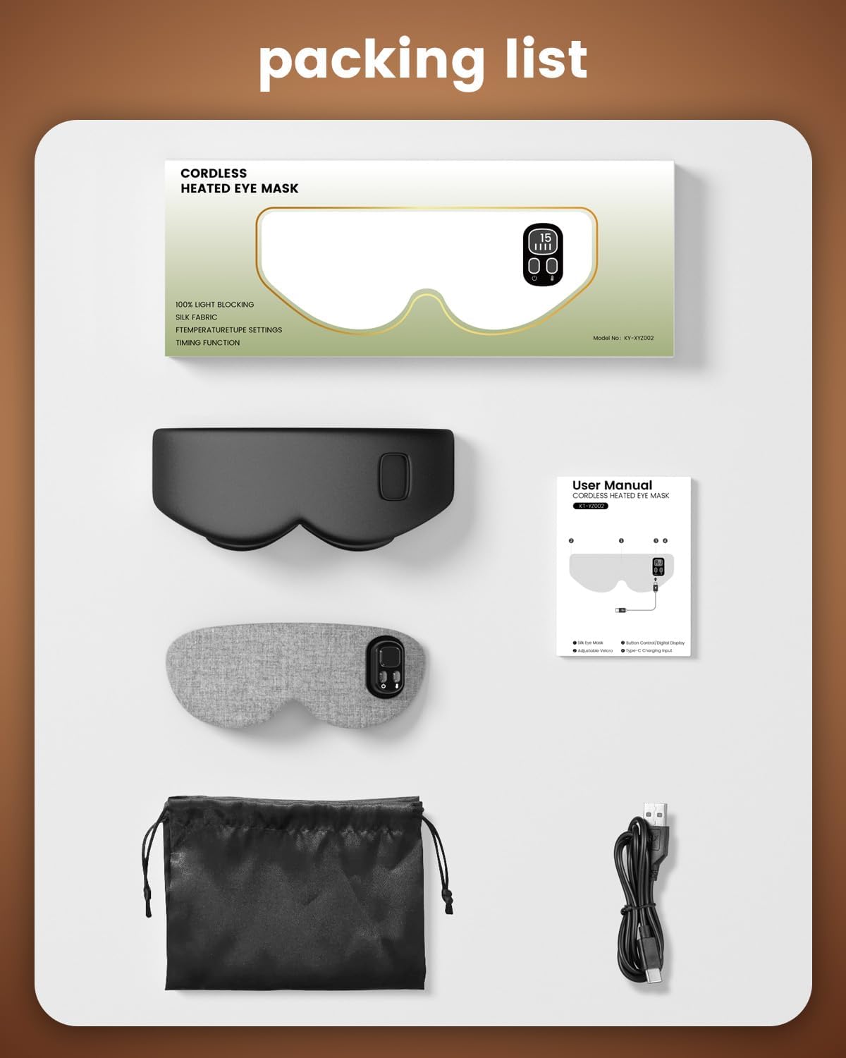 【True Cordless Freedom】Our heated eye mask goes beyond traditional wired design, saying goodbye to tangled cables and restraints. The 1500mAh battery provides up to 90 minutes of soothing warmth after a 1.5-hour charge. Whether traveling, taking a nap in the office, or using it before bed, you can enjoy heat therapy anytime, anywhere to relieve eye fatigue.