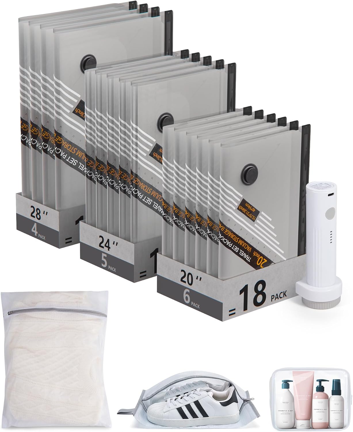 Complete 18-Piece Travel Set: This kit includes 15 vacuum storage bags in 3 sizes (15.75″ x 21.26″, 18.5″ x 25.2″, 21.6″ x 29.13″). Stay organized on every trip with the bonus shoe bag, laundry bag, and toiletry bag—your all-in-one packing solution
