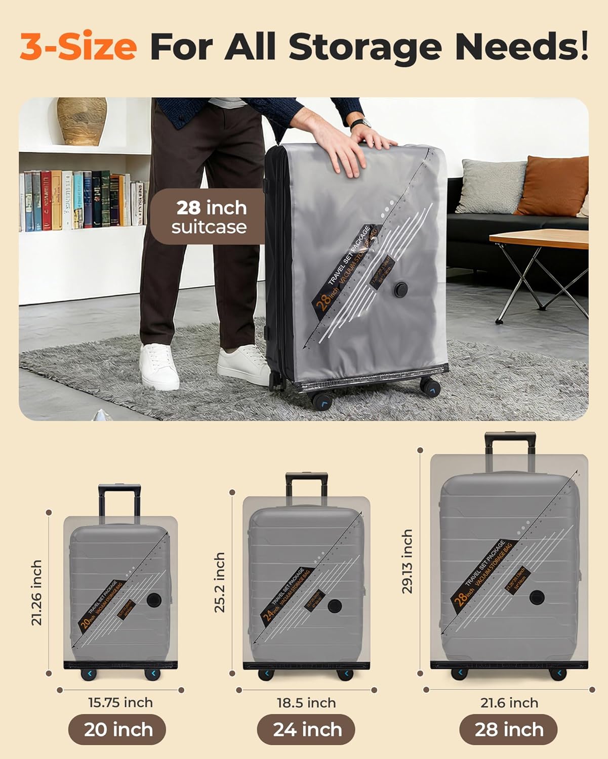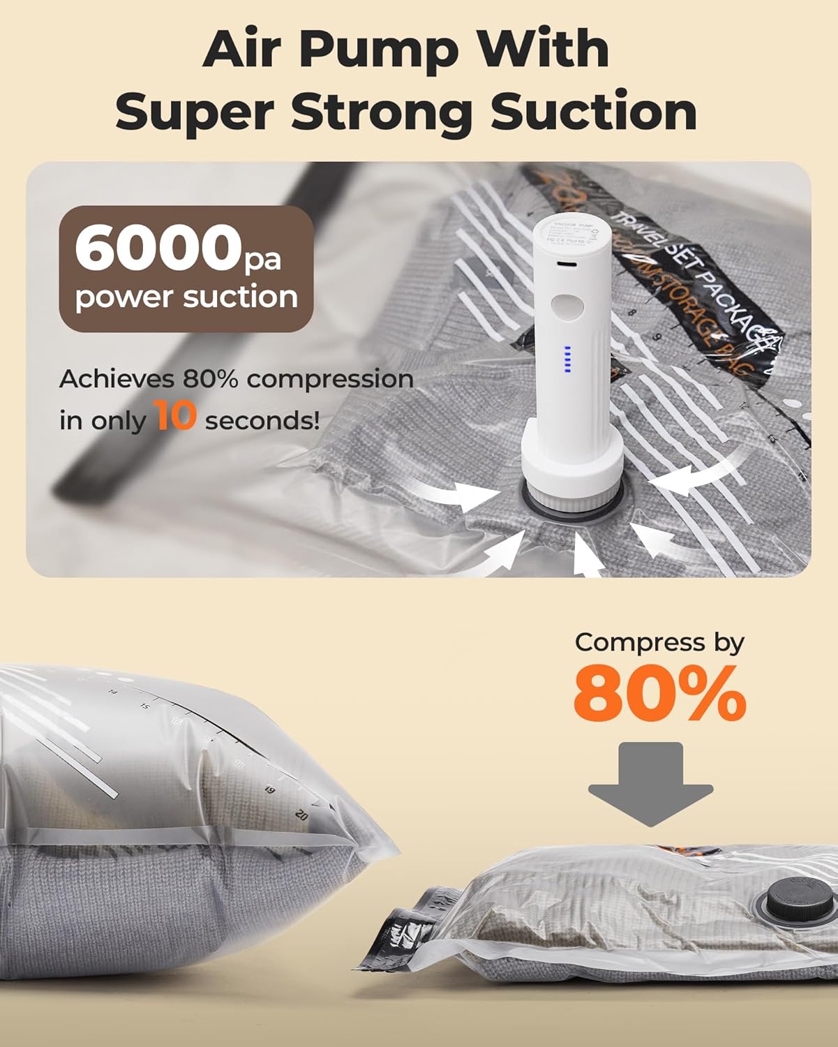 6000Pa High-Speed Compression: Saves up to 70% of storage space in seconds. Compress most travel vacuum bags in 15 seconds or less, and organize a full set in under 3 minutes.