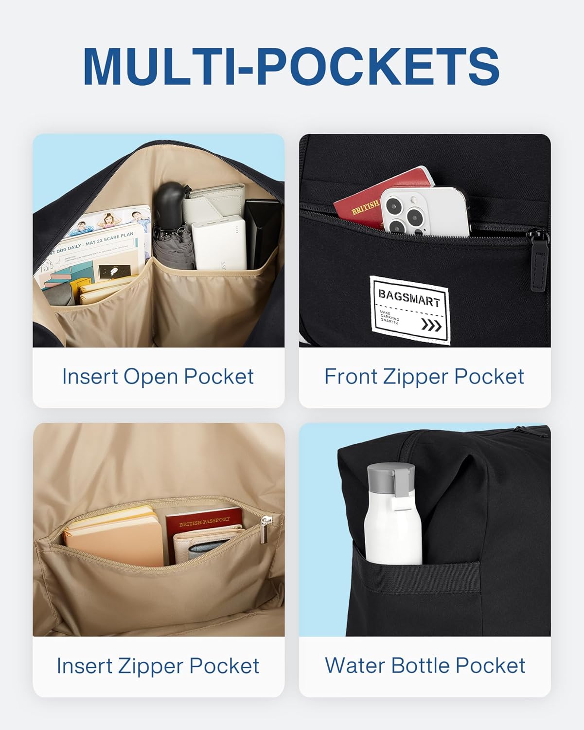 Multi Pockets: 8 pockets for storing your stuff. Inside: 1 zippered and 2 open pockets and 1 main pocket. Outside: 2 zippered pockets and 2 side pockets. The zippers are easy to grasp and smooth to move back and forth, making it easy to access your stashed items