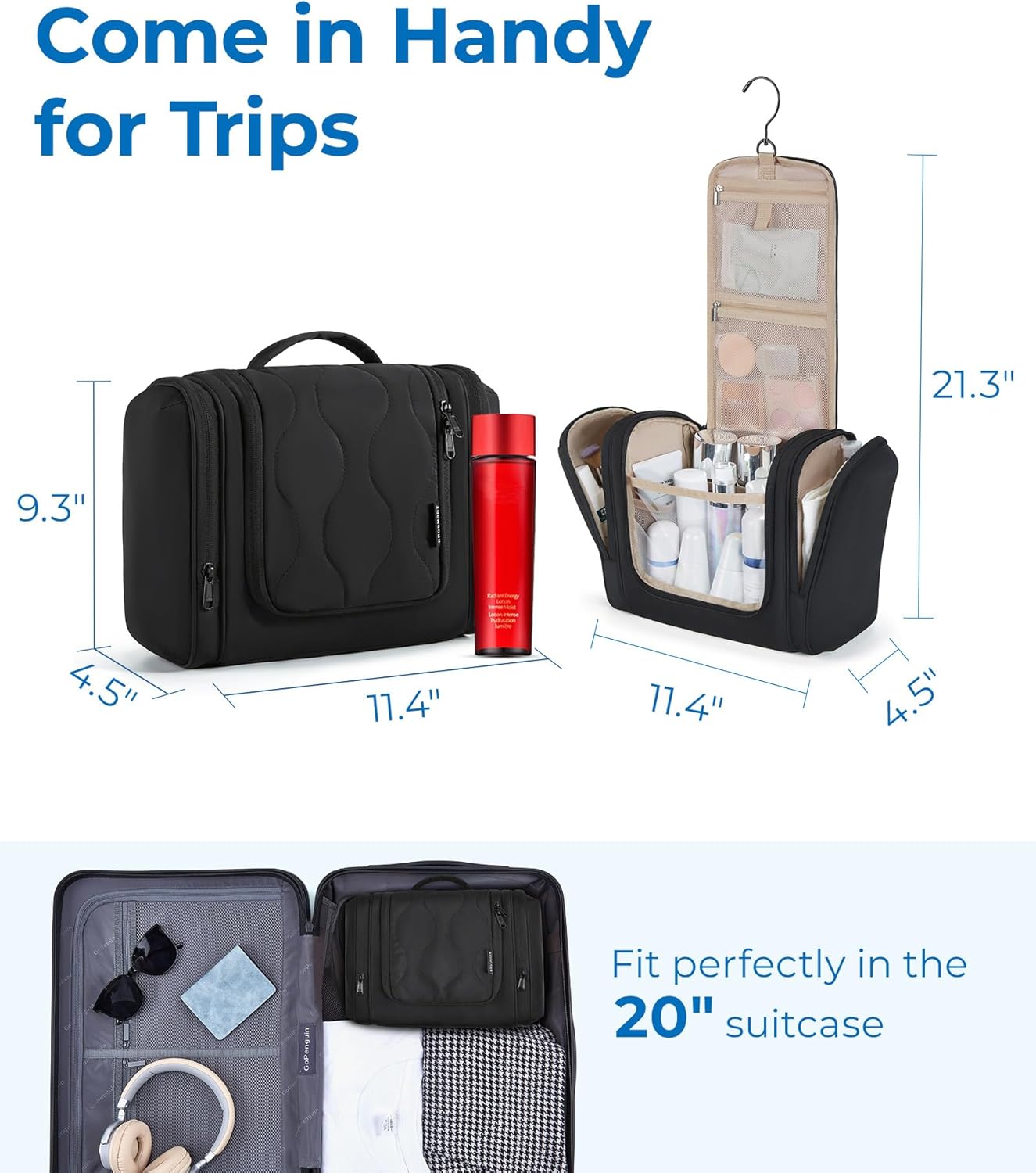Perfect Size & Lightweight: 11.4 x 4.5 x 9.3 inch (folded), 11.4 x 4.5 x 21.3 inch(unfold); lightweight: only 1.1lbs. Designed to be compact yet spacious enough to hold all travel essentials. The comfy padded handle allows effortless carrying, ideal size fits perfectly in any luggage.
