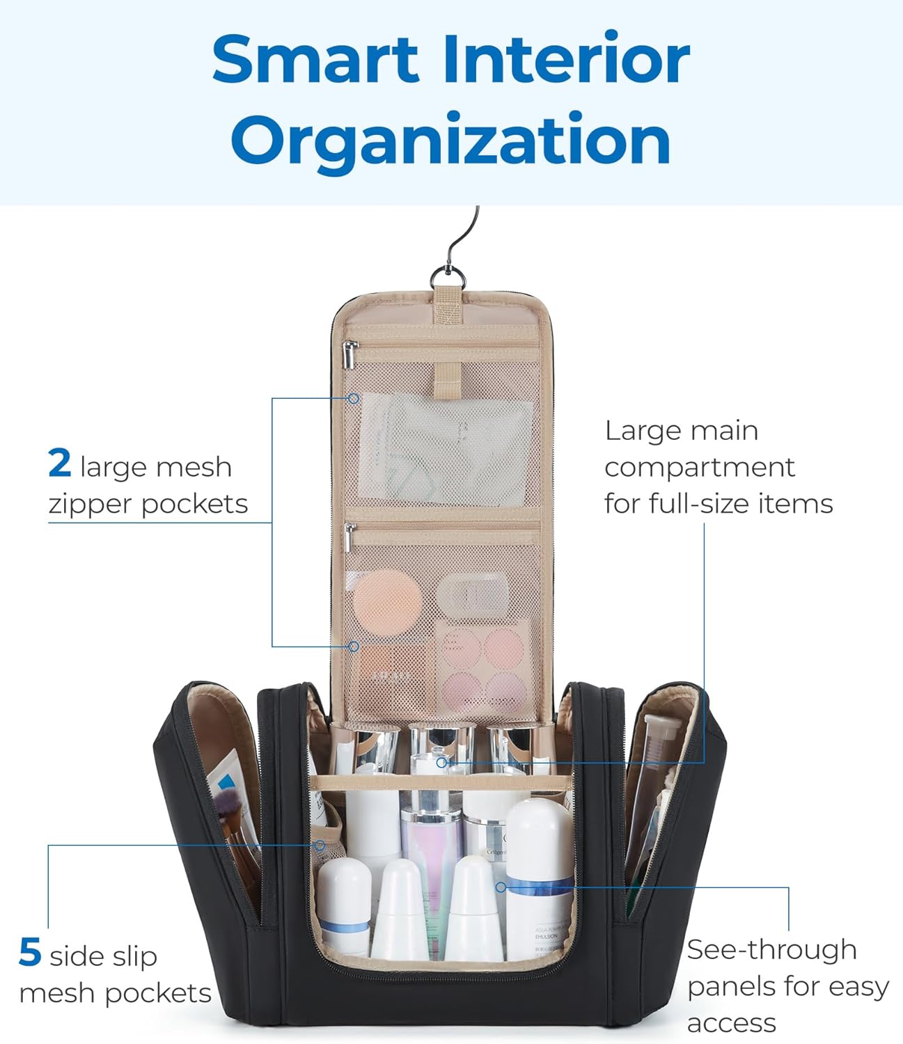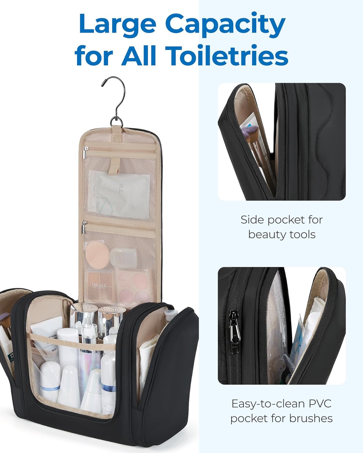 Convenient Design: The U-shaped large opening and double zippers allow easy access, while the transparent PVC section offers clear visibility of contents. The stow-away 360-degree swivel non-slip metal hook provides versatile hanging options.