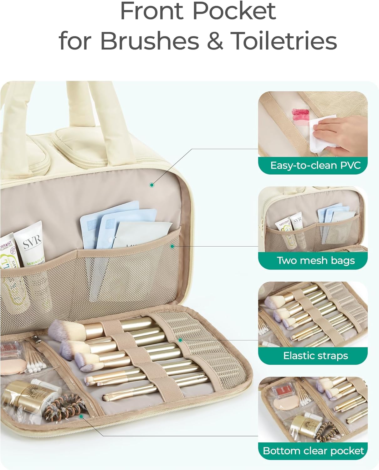 Dry-and-Wet Separation: The large toiletry bag with a waterproof PVC fabric and a front zipper pocket can help keep wet and dry items separate and make it easy to clean.