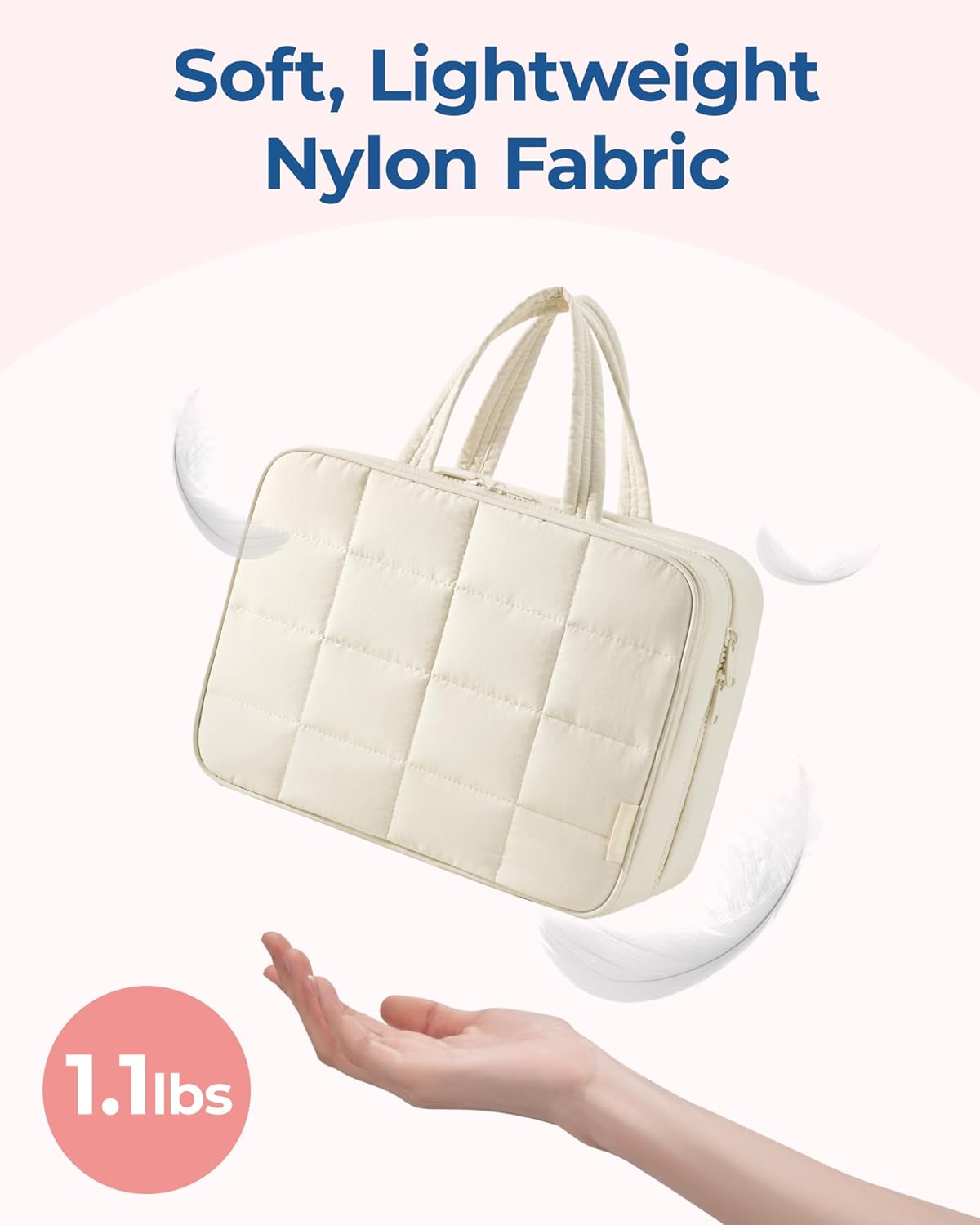 A puffy fabric bag is made from soft, quilted material that offers a lightweight, cushioned feel with a trendy, padded look. Perfect for all occasions, it can be used as a toiletry bag, makeup bag, jewelry organizer, handbag, and more, meeting all your needs. Get yours now!