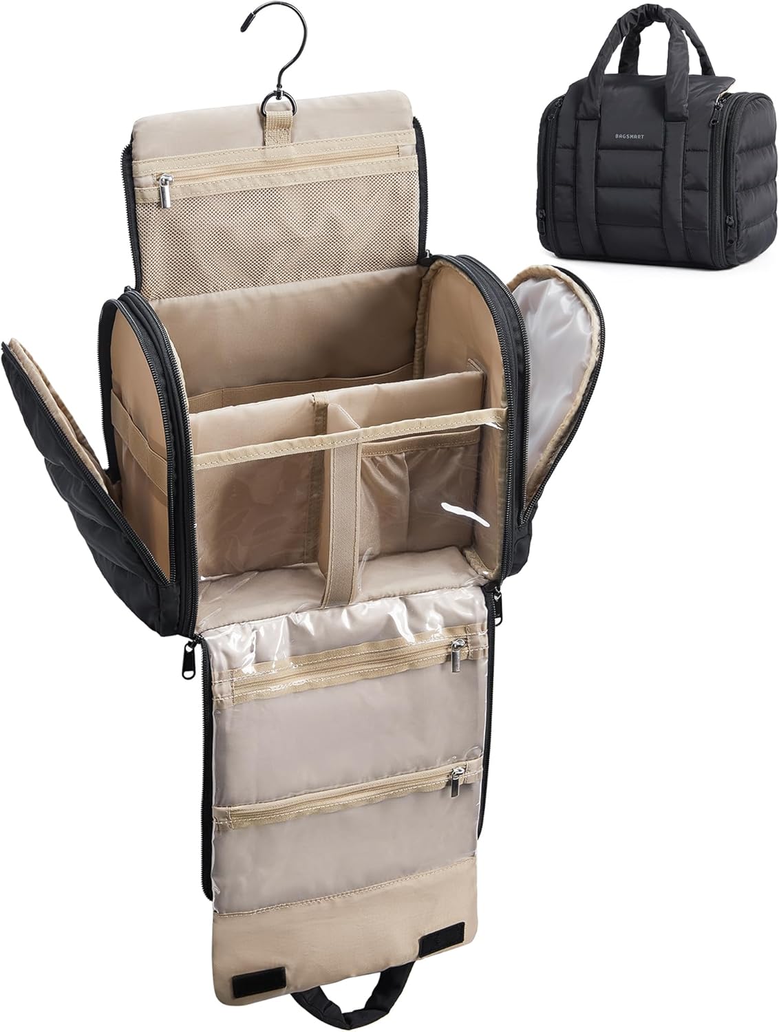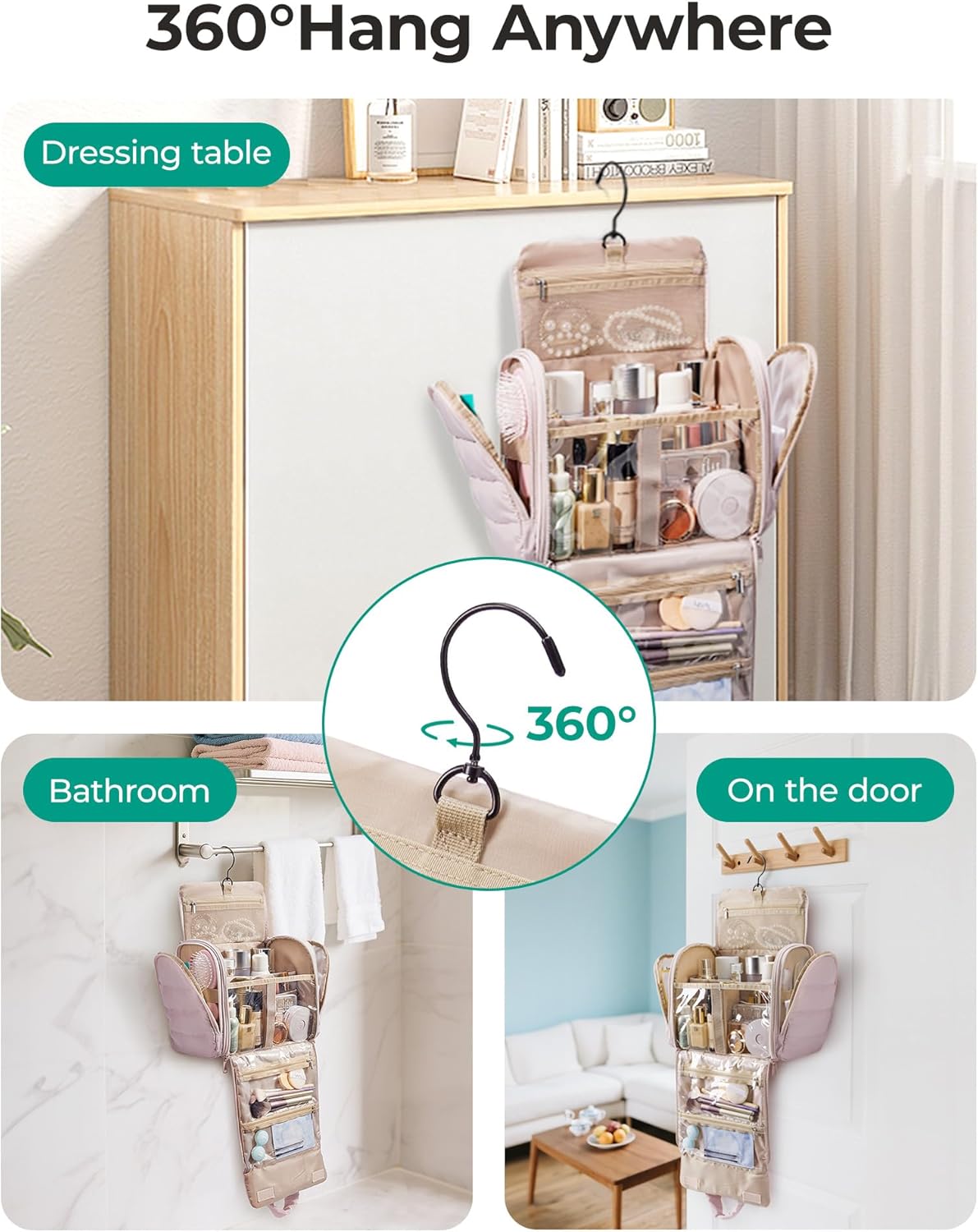 Effortless Visibility & Access: Wide-opening design + transparent zippered pockets provide clear visibility and easy access to your items. Features smooth-gliding dual metal zippers​and a 360° swivel hook—hang anywhere (towel racks, doors, hooks) to free up counter space