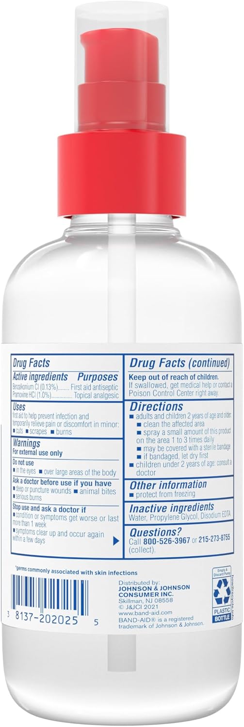 Band-Aid Brand Pain Relieving Antiseptic Cleansing Spray helps clean and relieve the pain of minor cuts, burns, and scrapes. Formulated with the topical analgesic pramoxine HCl, this pain relieving antiseptic spray helps alleviate the pain and discomfort of minor wounds. The no-sting spray also contains benzalkonium Cl, a first-aid antiseptic, to kill 99.99%* of germs and help prevent infection. The perfect addition to any at-home or office first aid kit along with other essential wound care supplies, the first aid antiseptic spray is safe and effective for wound care on adults and kids ages 2 and older. To use, apply a small amount on the affected area one to three times daily and once dry, cover the wound with a sterile bandage. *germs commonly associated with skin infections