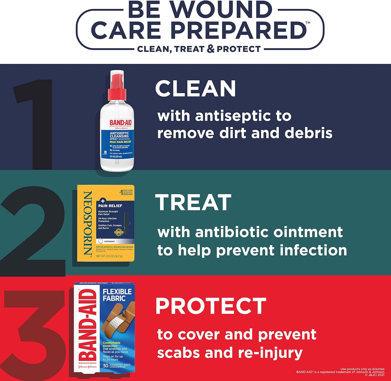 8-fluid ounce spray bottle of Band-Aid Brand Antiseptic Cleansing Spray to help clean and relieve pain of minor wounds, cuts, scrapes, and burns