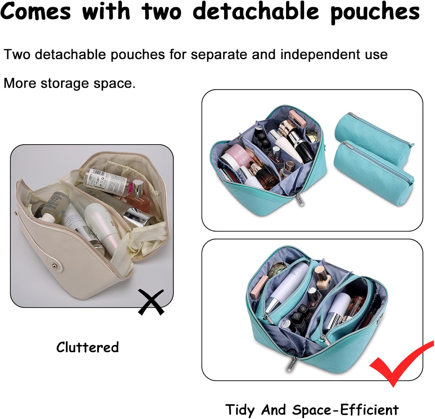 This travel makeup bag is good for 1-14 days trips or vacation. It will come with two small makeup pouches, which keep your skincare products and cosmetics organized more easily.