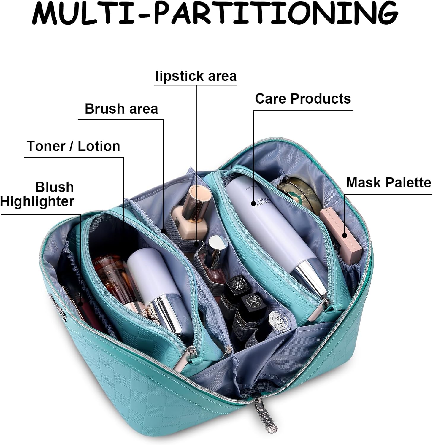 The size of this travel cosmetic bag is 9.25*5.1*5 inches, enough room to holds all of the lipsticks, makeup brushes, toner, lotion, blushighlighter,and mask palette for 1-14 days trips or vacation.