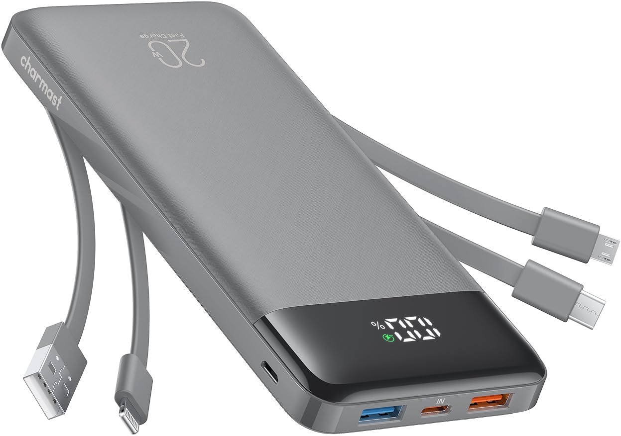 3-in-1 Built-in Cables: No more hunting for cables! Power bank Built in USB-C, Lightning and Micro-USB cables – simply plug in to charge instantly. It eliminates cord clutter while keeping all your devices powered anywhere. Never face a dead phone again!