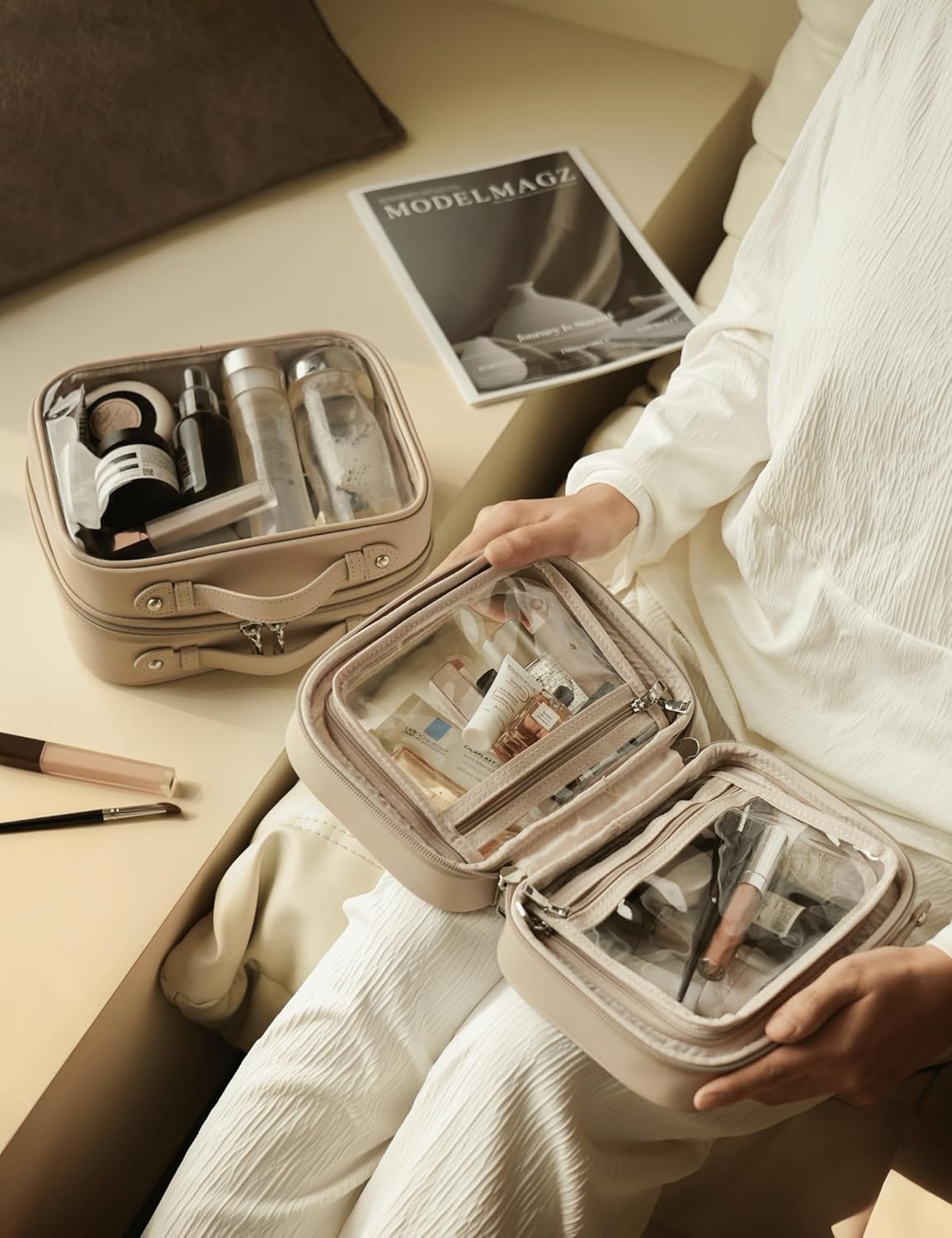 [See Through & Easy Access] — The cosmetic travel case is designed with clear viewing windows, making it easy to locate your items and access them quickly. Its compact size also makes it TSA-friendly for air travel (limited to travel-sized containers that are 3.4 ounces (100 milliliters) or less per item).