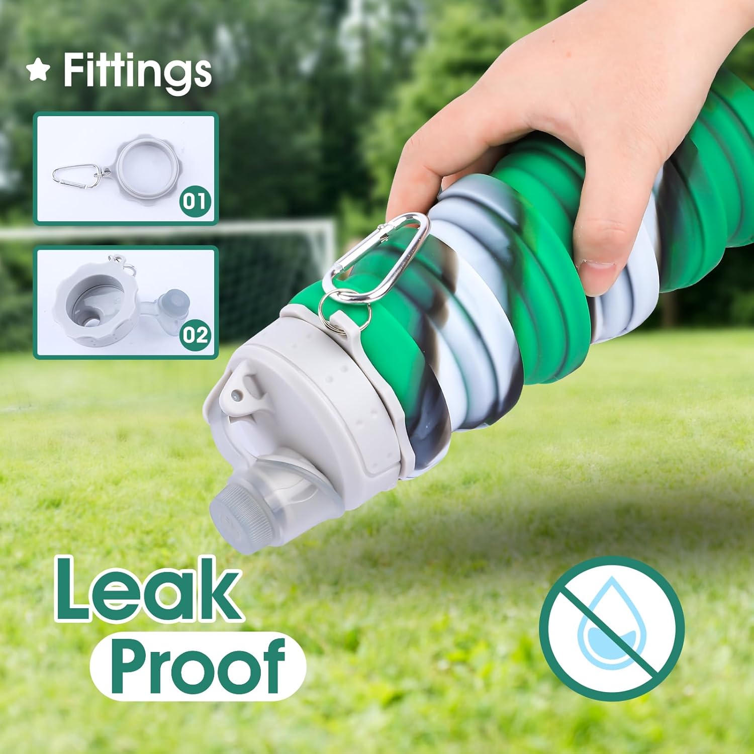 The collapsible water bottle has a silicone sealing ring to prevent water from splashing out.