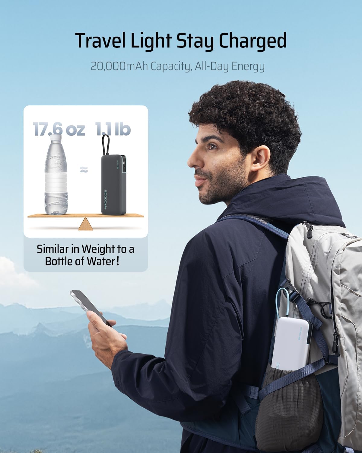 【Built-in USB-C Cable for Fast-Charging】Ditch the cable clutter! This power bank features an integrated USB-C charging cord tested to withstand 10,000+, ensuring durability that matches your adventurous lifestyle. It can also serve as a carrying strap for easy portability in backpacks or pockets. Supporting 45W MAX high-speed charging delivers about 50% charge to Galaxy S24 Ultra in under 20 minutes.