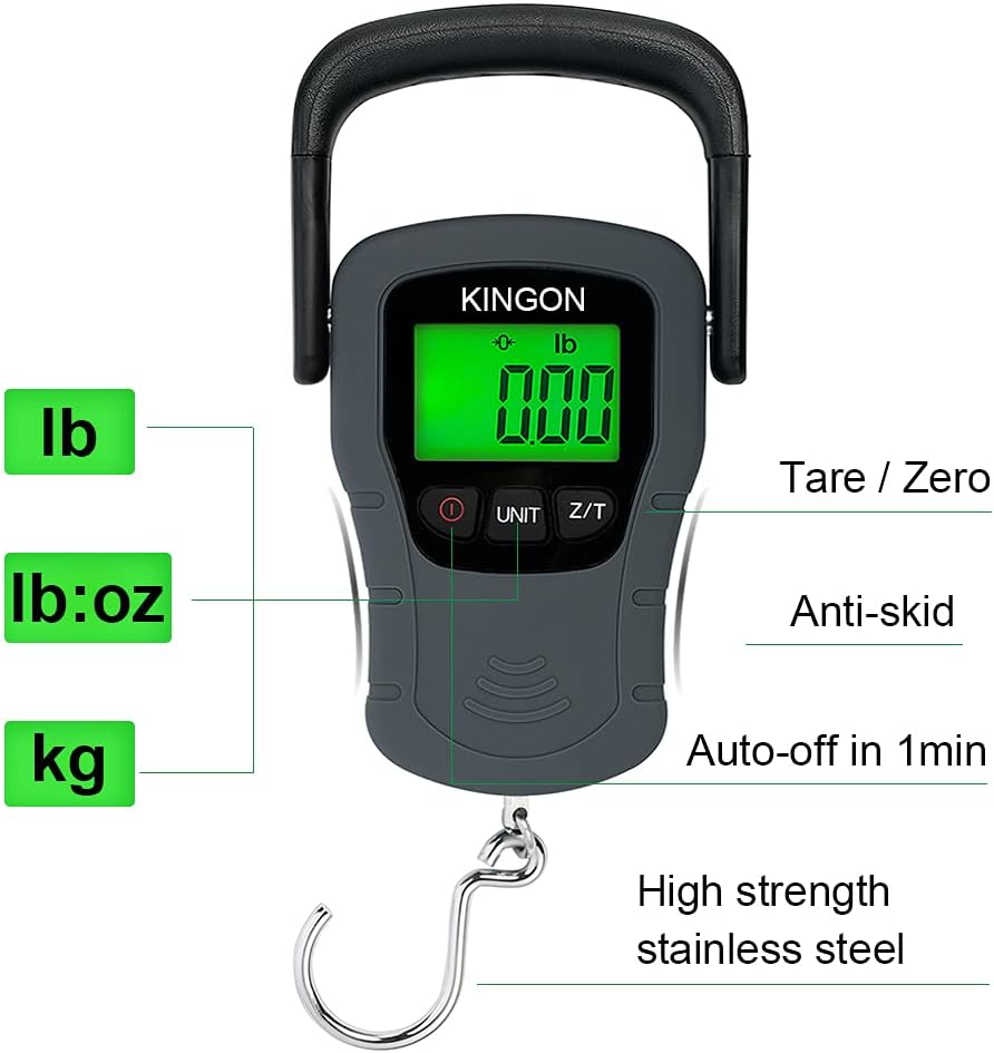 UNIVERSAL – You can set peak/max, hold on, hold off; backlit on/off; 10g/12g/25g/50gincrement. 3 units: lb/kg/lb.oz. Our digital hanging scale can also be used to weigh fish, backpack, bow draw weight, bike, feed, hay etc.