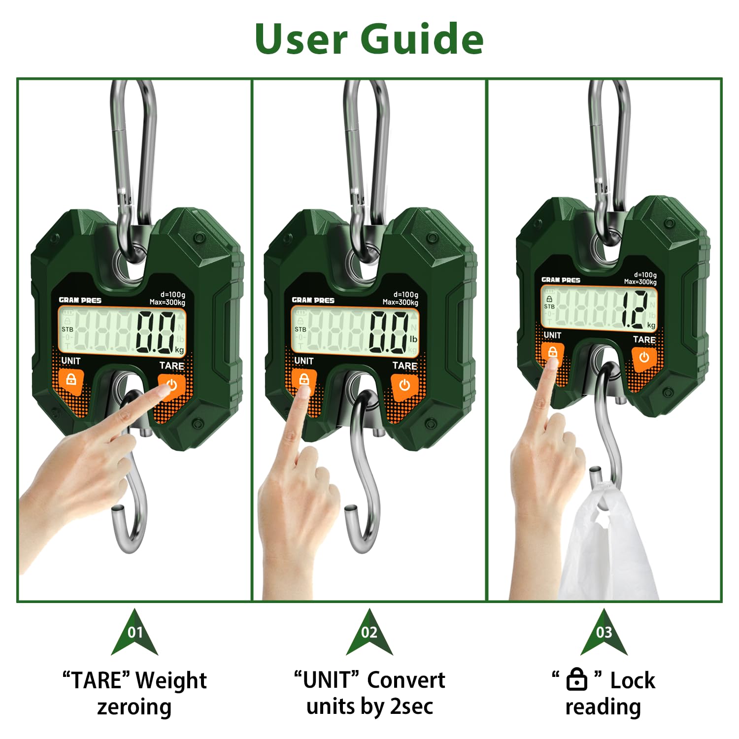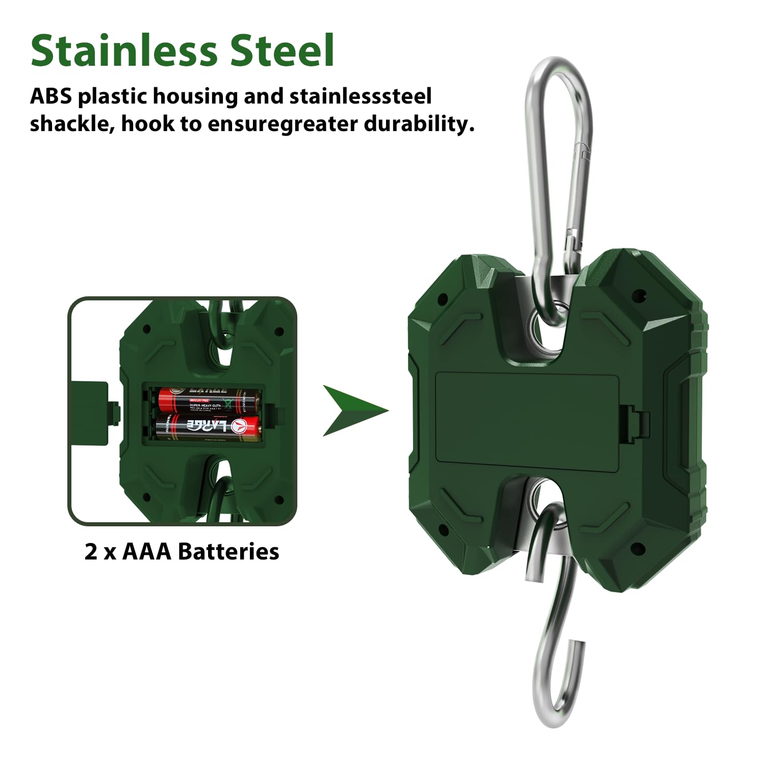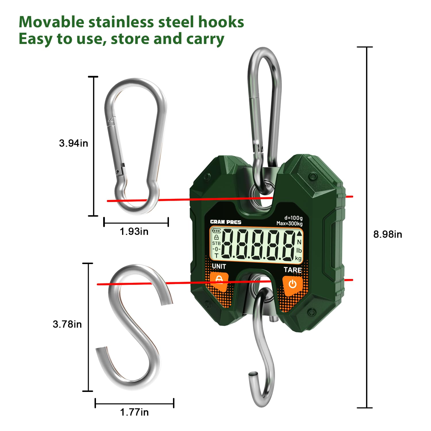 Enhanced Hooks:This digital crane scale comes with a closed loop hook made of sturdy thick stainless steel and has a maximum load capacity of 300 kg/660 lbs.