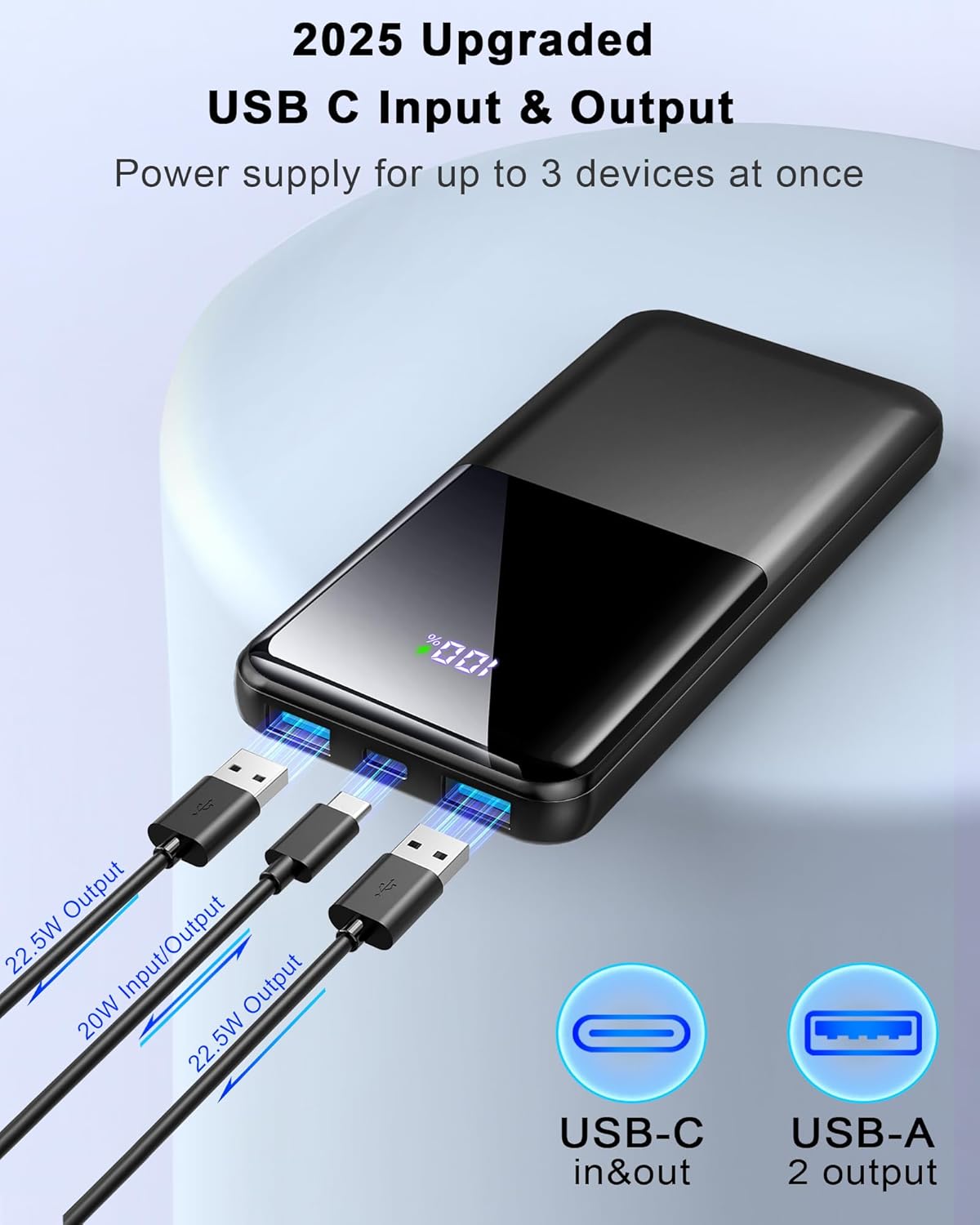 22.5W Fast Portable Charger: The core of this 25W fast charging power bank is its powerful fast charging technology. With 25W PD 3.0 output and QC 4.0 output, it allows you to live a fast-paced life without worrying about insufficient power and affecting your work and life efficiency. This 25W powerbank is equipped with USB-C and USB -A fast charging ports. Whether it is the latest smartphones or other compatible electronic devices, it can be quickly charged in a short time.