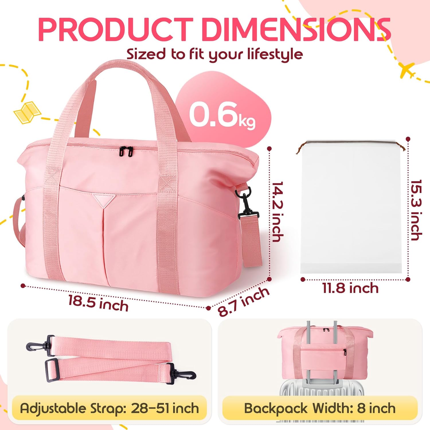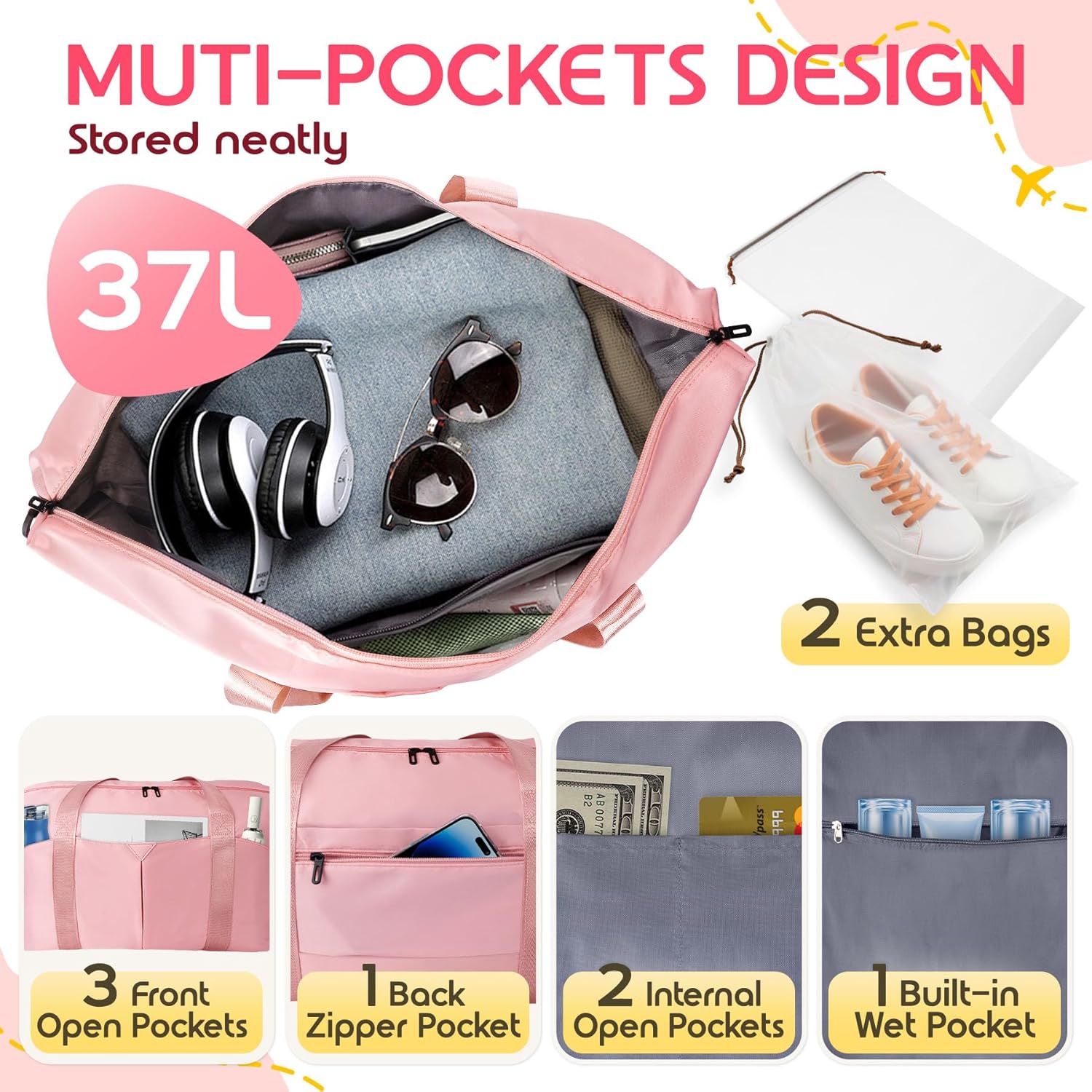 Airline-friendly Travel Bag: Duffel bag measures 18*14*8 inches, well-suited to fit under the seat, providing peace of mind while keeping your belongings within easy reach. With a 37L capacity, it can hold up to a week’s worth of travel-essentials