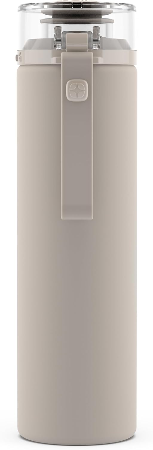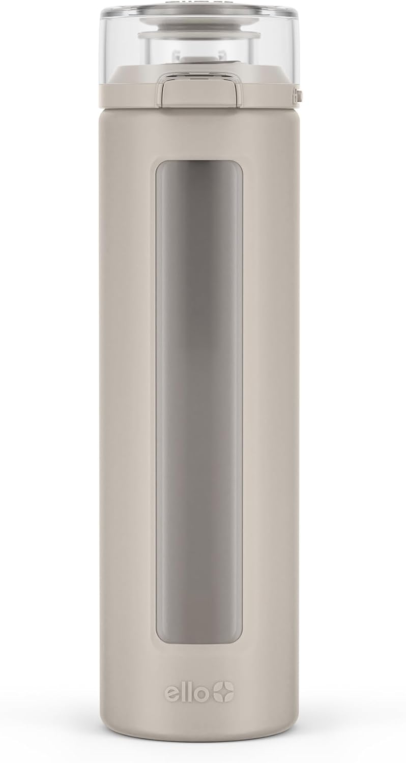 The Ello Syndicate Glass Water Bottle is made of clean-tasting glass that won’t leach, stain or smell. Say goodbye to plastic and enjoy the pure pleasure of drinking directly from glass. Syndicate’s convenient one-touch flip lid is designed to be leakproof and easy to drink from. The bottle is further enhanced by an FDA food-grade silicone sleeve, ensuring a secure, slip-free grip while safeguarding the glass. With its dishwasher-safe feature, the Syndicate reusable glass water bottle is your ideal companion for on-the-go hydration, whether it’s during school, work, or a gym session. For best performance and safety, do not microwave, freeze, or use with hot or carbonated beverages, and avoid harsh cleaners containing bleach, chlorine, or abrasives. Glass is a fragile material and may break upon impact; if the bottle becomes cracked or broken, discontinue use immediately. All parts are BPA-free.