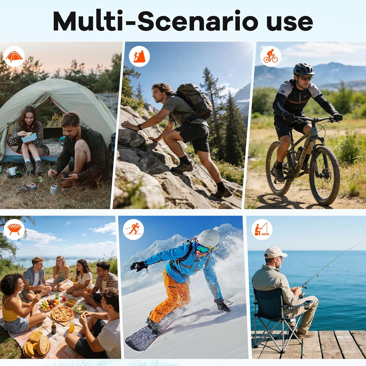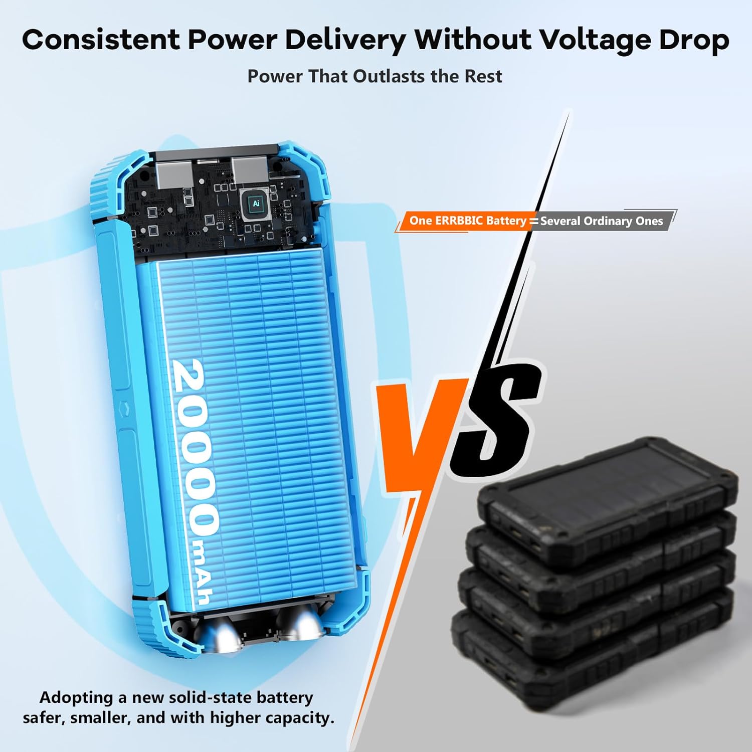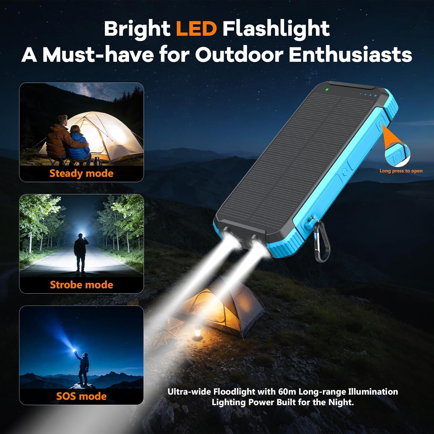 【Emergency Survival Kit】: 3-mode LED torch (steady/flashing/rescue). 20000mAh capacity can charge iPhone 15 up to 4.3 times, 5.5V/300mA high efficiency solar panel with overheat protection (>50°C/122°F auto shut-off) and extreme temperature tolerance (-20°C~60°C). 30 seconds no operation auto shut-off to save power consumption. The device is designed with a mountaineering buckle to keep you safe. Comes with a mountaineering buckle to make your outdoor travelling worry-free.