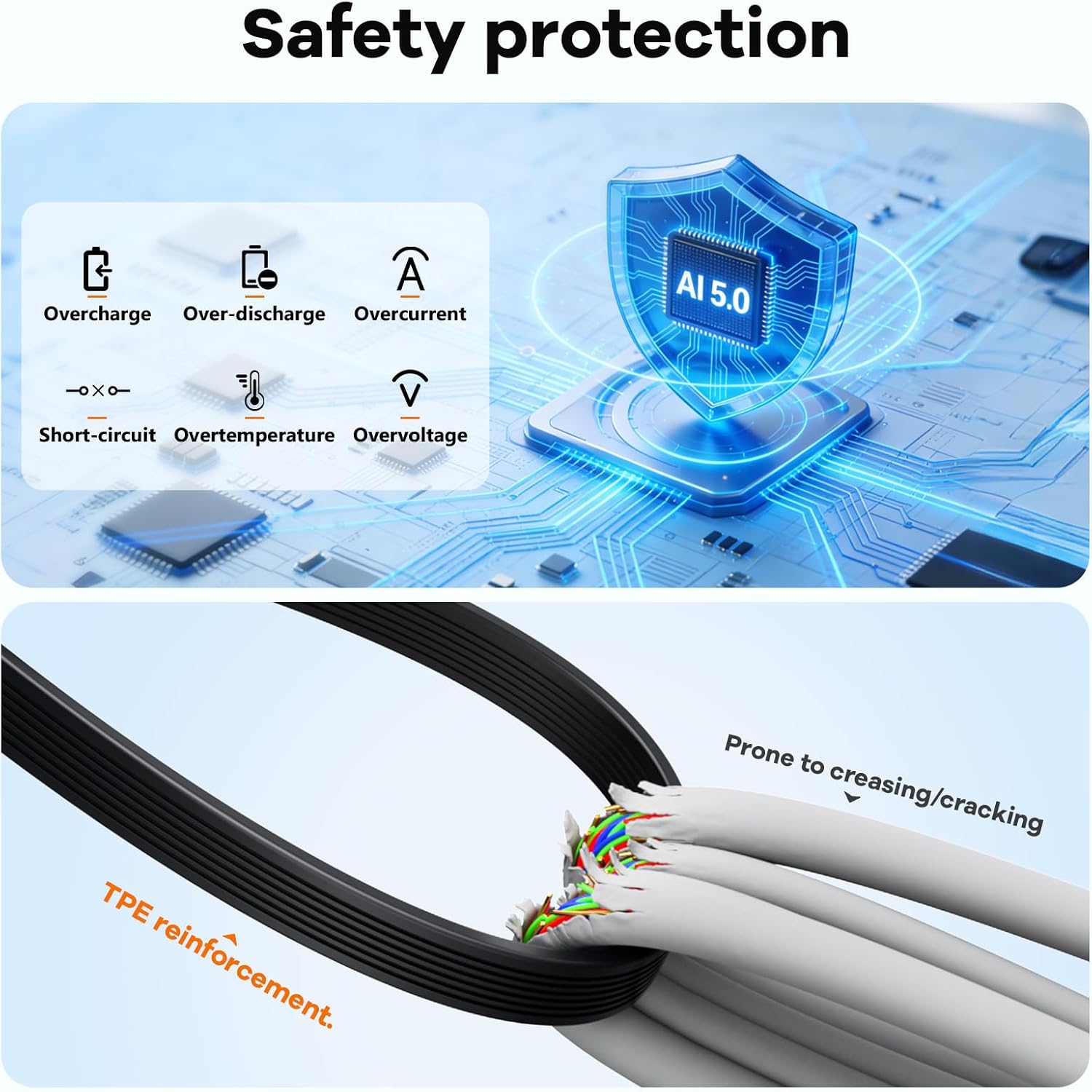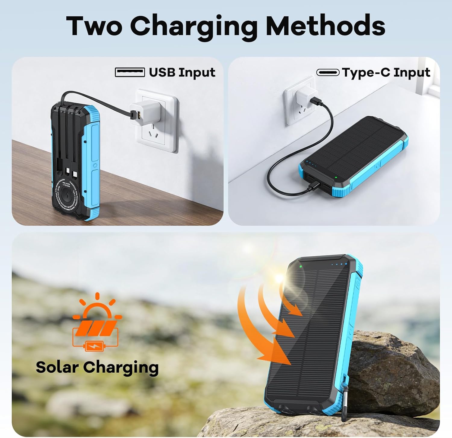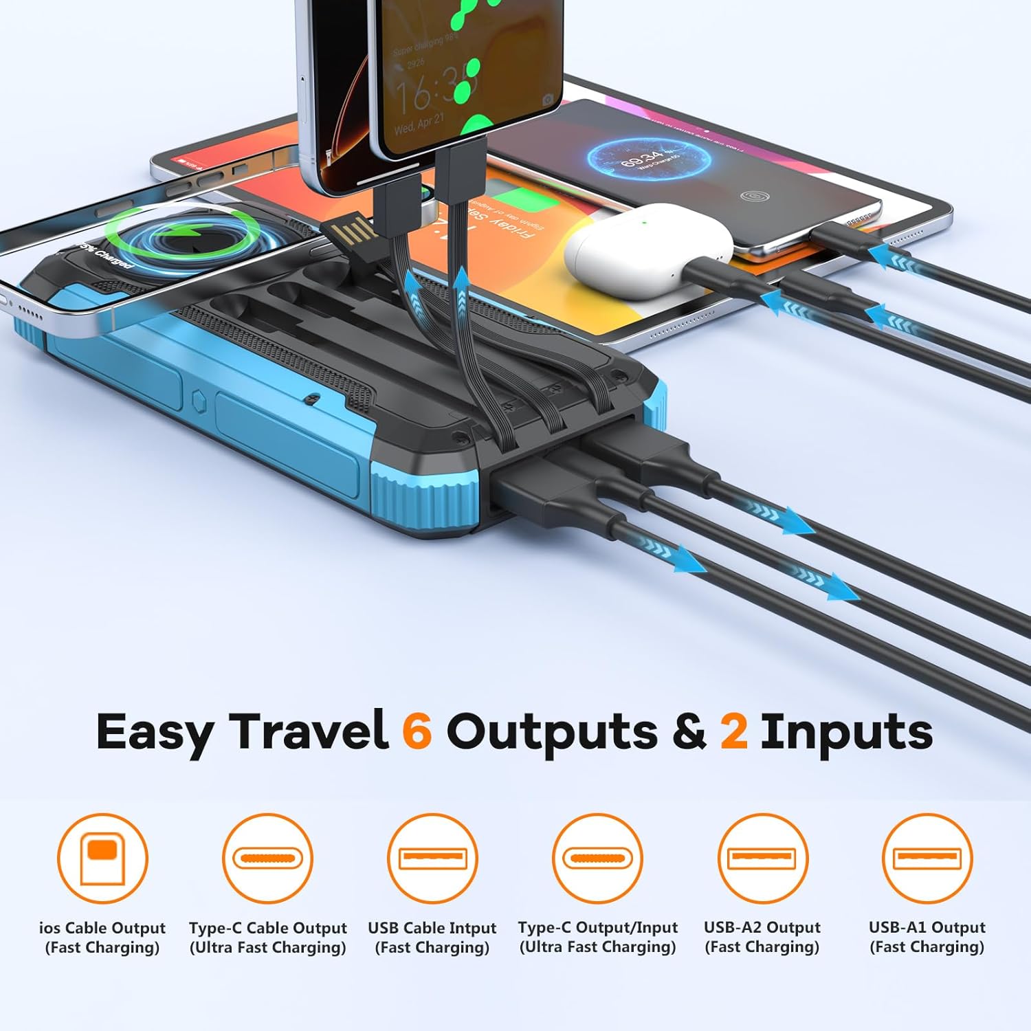 【Built-in Cables】: Say goodbye to carrying multiple charging cables. The solar charger has 3 built-in output cables (Type-C/Lightning/USB-A), multiple external output ports (2 USB-A + 1 PD Type-C), and Qi 5W wireless charging, which can meet various charging needs. Certified by UL2056/UN38.3 for safe charging.