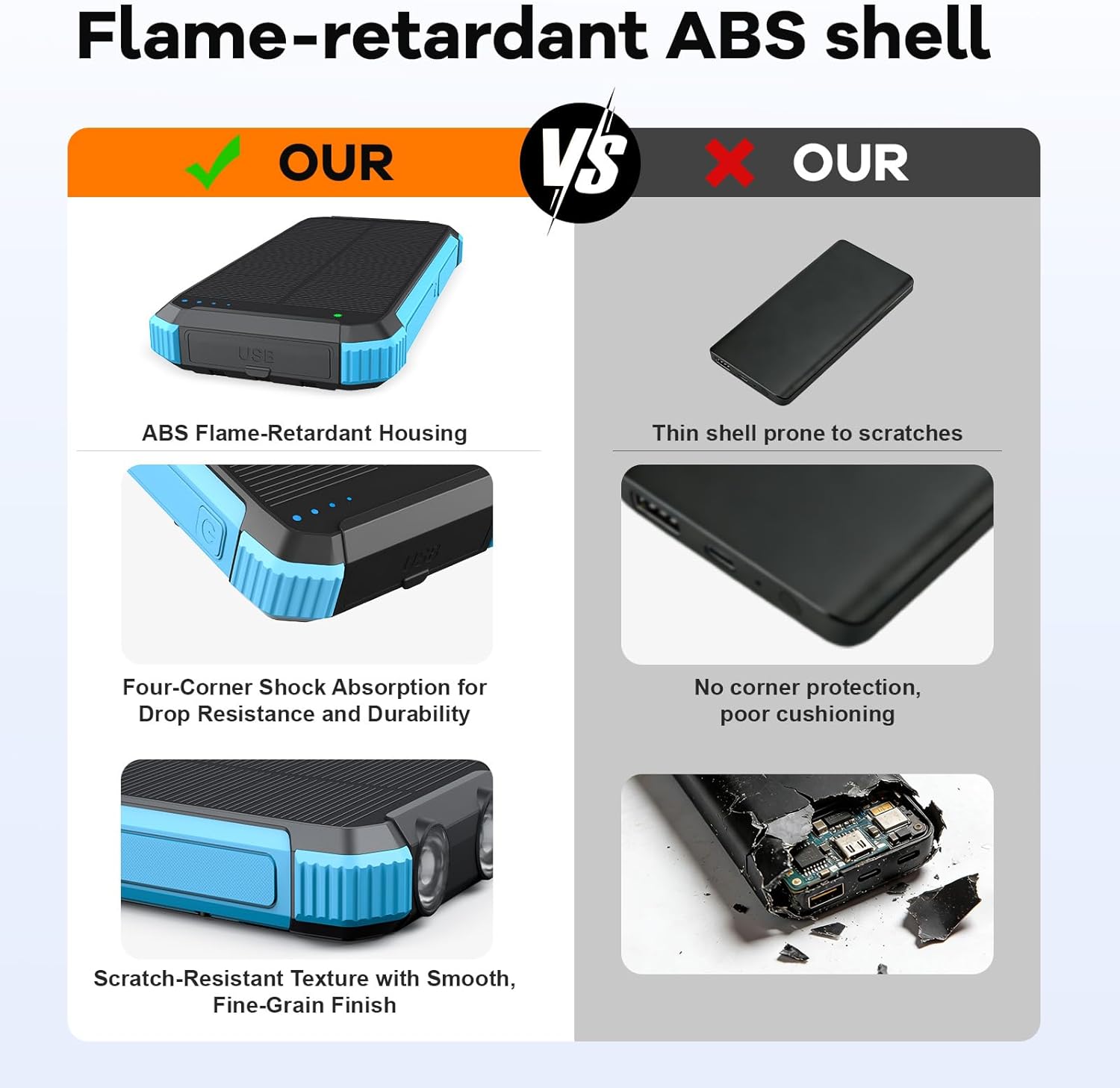 【EXCELLENT MATERIAL】: The solar mobile charger is made of sturdy professional ABS material, explosion-proof lithium polymer battery, 8-fold protection (overcharge/short circuit/temperature control). Passed multiple safety tests including 5 feet drop and salt spray corrosion test. Resistant to chemical corrosion and high temperature, super hard surface with high elasticity and toughness. Waterproof, drop-proof and dust-proof, so you no longer have to worry about damage caused by water/drop, the mobile power can work in extreme environments.