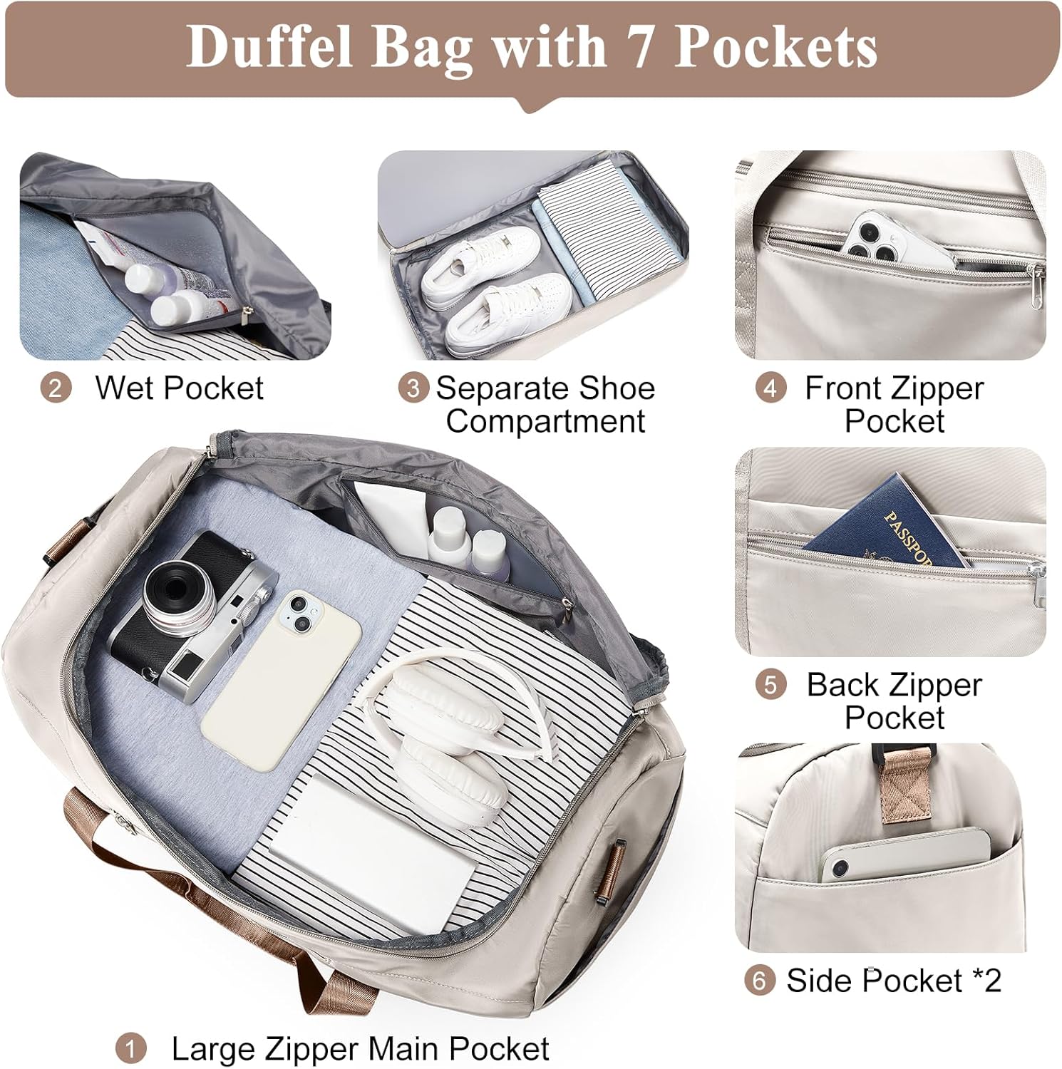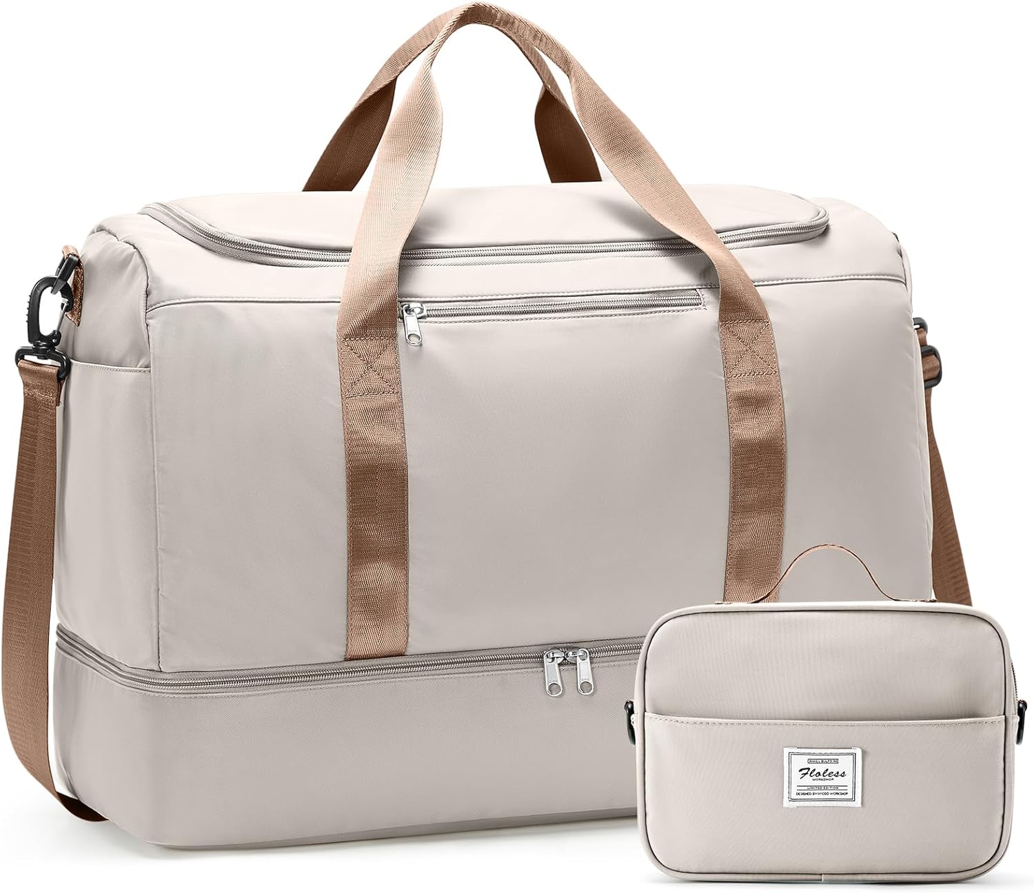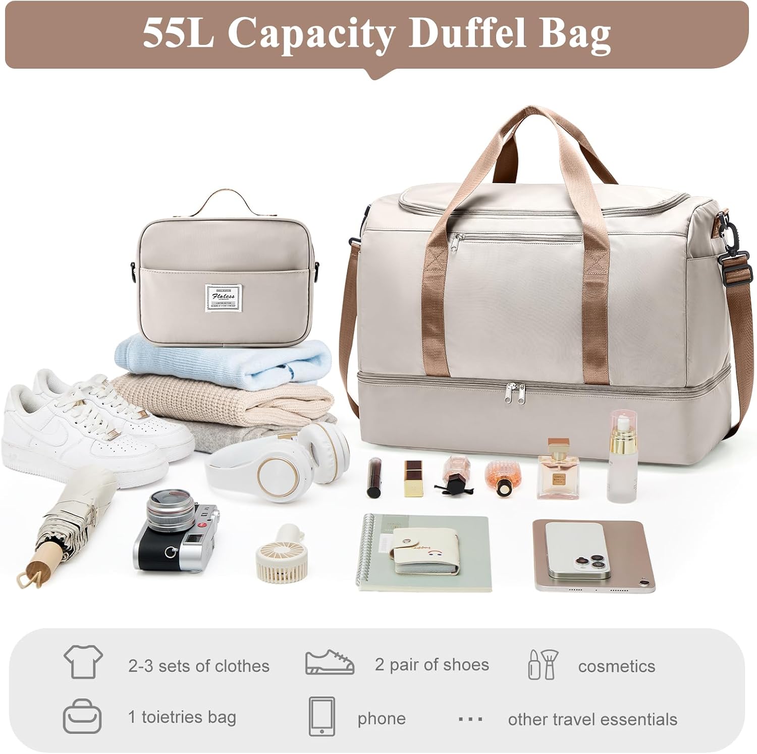 55L Extra Large Capacity: This spacious weekender bag easily holds 3-7 days of essentials. With 7 strategic pockets plus the separate toiletry bag, your clothes, electronics, and beauty products stay perfectly organized. No more rummaging—the dedicated cosmetic bag keeps your liquids separate and accessible