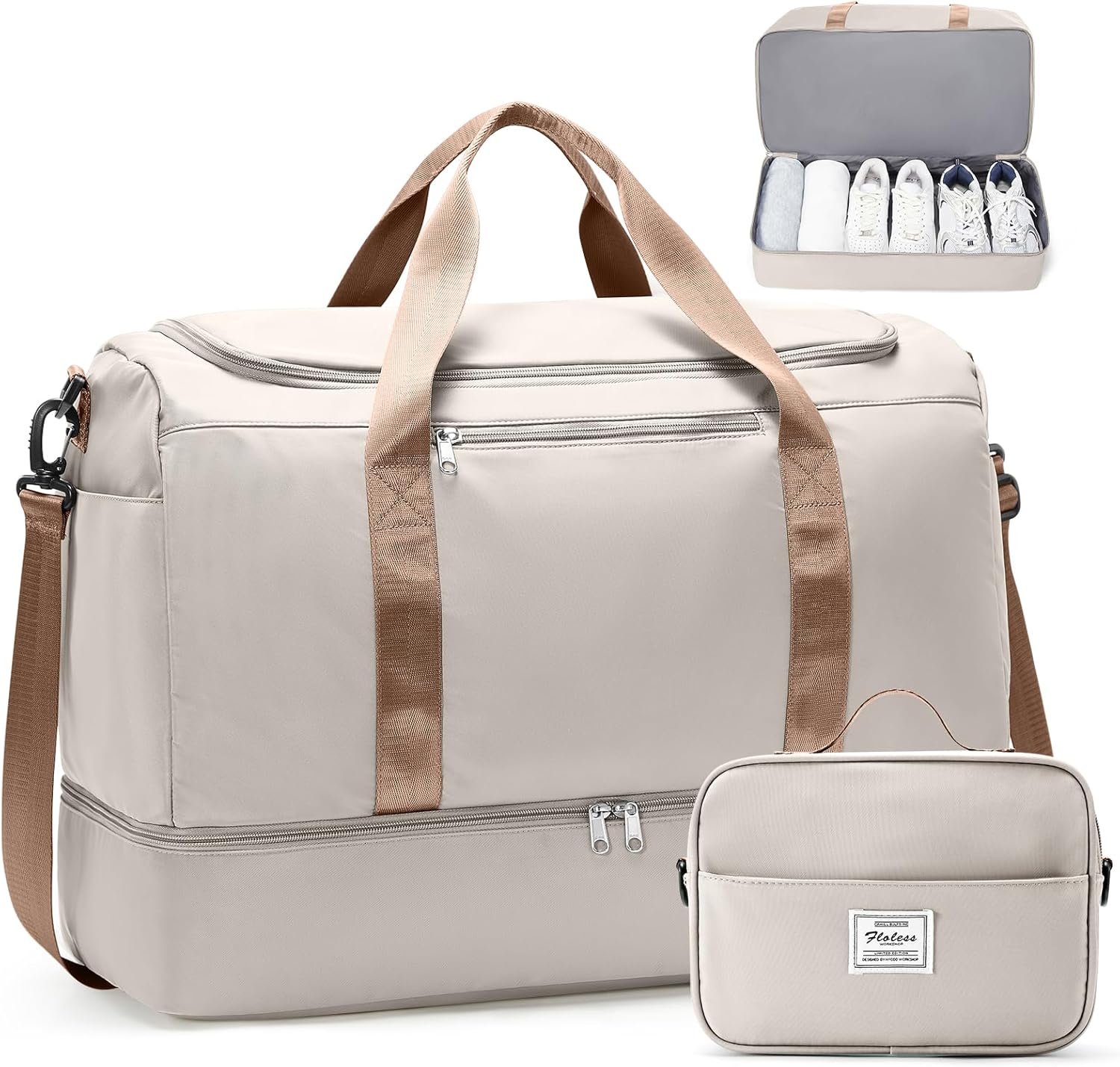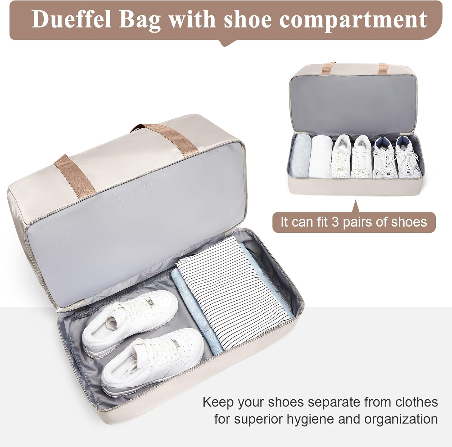 Travel Bag with Shoe Compartment: The reinforced bottom compartment is designed to keep up to 3 pairs of shoes or dirty laundry separate from your clean clothes. This wide-access, ventilated design ensures your main cabin stays fresh and odor-free, making it ideal for gym, travel, or outdoor adventures