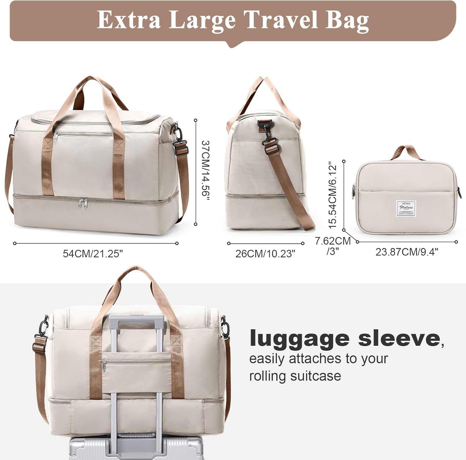 2-In-1 Travel Set & Airplane Friendly: This set includes a large travel duffle bag and a matching toiletry bag (9.4″x3″x6.12″) for your cosmetics. Measuring 21.25″x10″x14.5″, the travel bag meets most international carry-on requirements. Weighing only 1.6 lbs, it maximizes your packing space while helping you avoid expensive checked bag fees